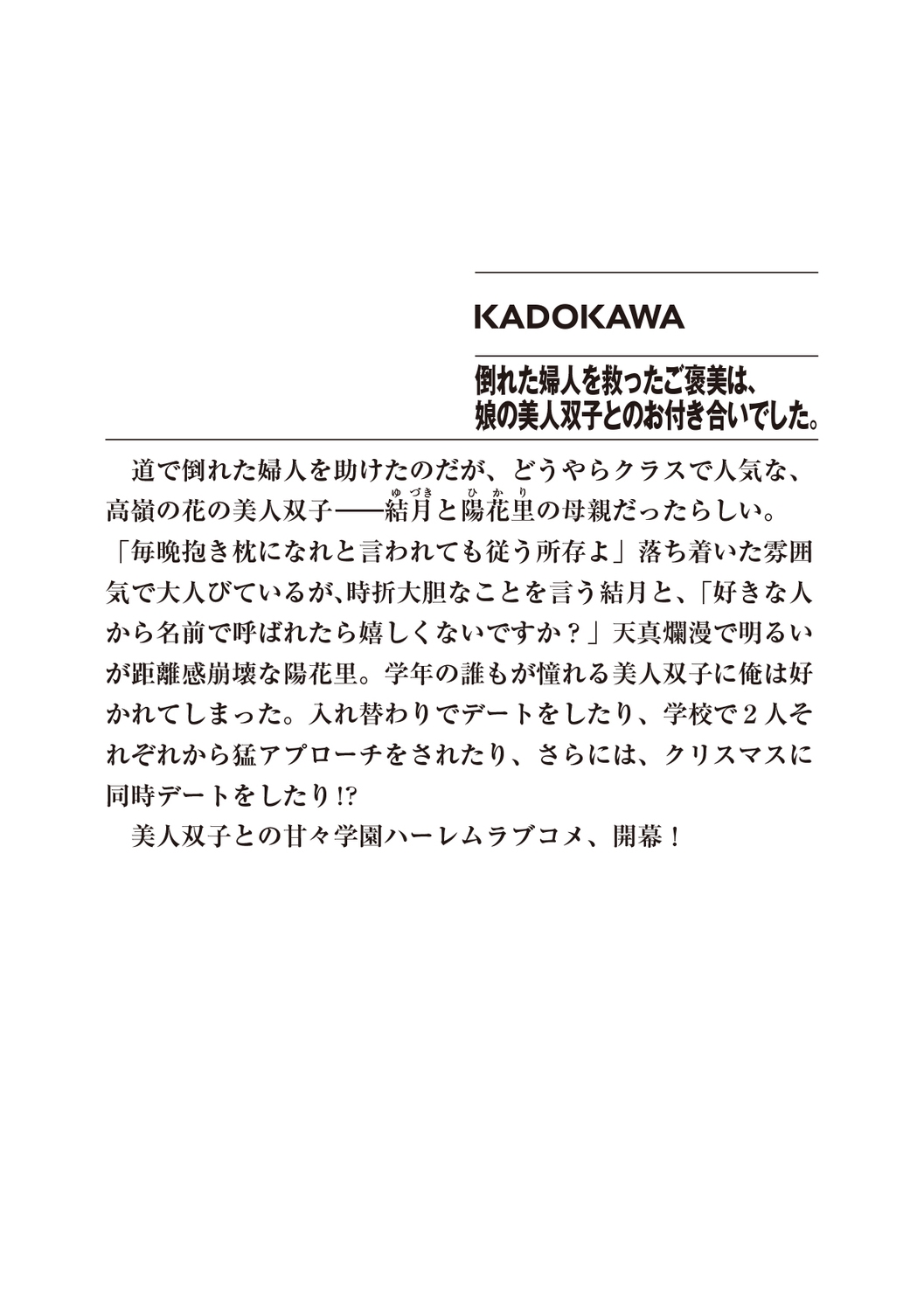 道で倒れた婦人を助けたのだが、どうやらクラスで人気な、高嶺の花の美人双子――結月と陽花里の母親だったらしい。