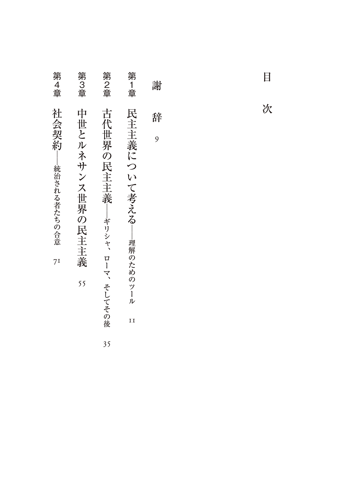 本書は、ポスト・トゥルース的な右派ポピュリズムが席捲するように見える現代の民主主義の危機を理解し、それに応答するために、民主主義の普遍的な理念とその具体的な実現の両方に軸足を定めつつ、古代から中世・ルネサンス、社会契約論から十九世紀のマルクス主義などの進歩主義、第二次世界大戦の衝撃から二十世紀後半の社会運動、そして現在進行中の出来事へと論を運ぶ。