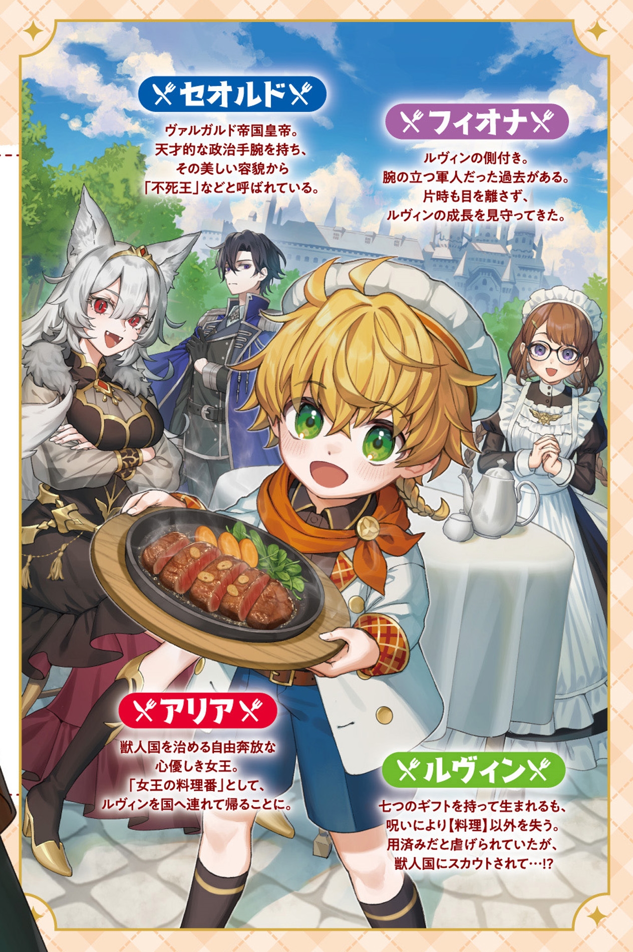 セリディア王国の第七王子・ルヴィンは幼いながらに7つのギフトを使いこなし、希代の才児と注目されていた。しかし、あるとき父・国王の代わりに呪いを受け、【料理(レシピ)】以外のすべてのギフトを失ってしまう。周囲の評価は一変し、用済みだと罵られる毎日。それでも「料理で王国の役に立ちたい!」と健気なルヴィンに声をかけたのは、未開の国と蔑まれる獣人国の強く美しい女王・アリアだった。
