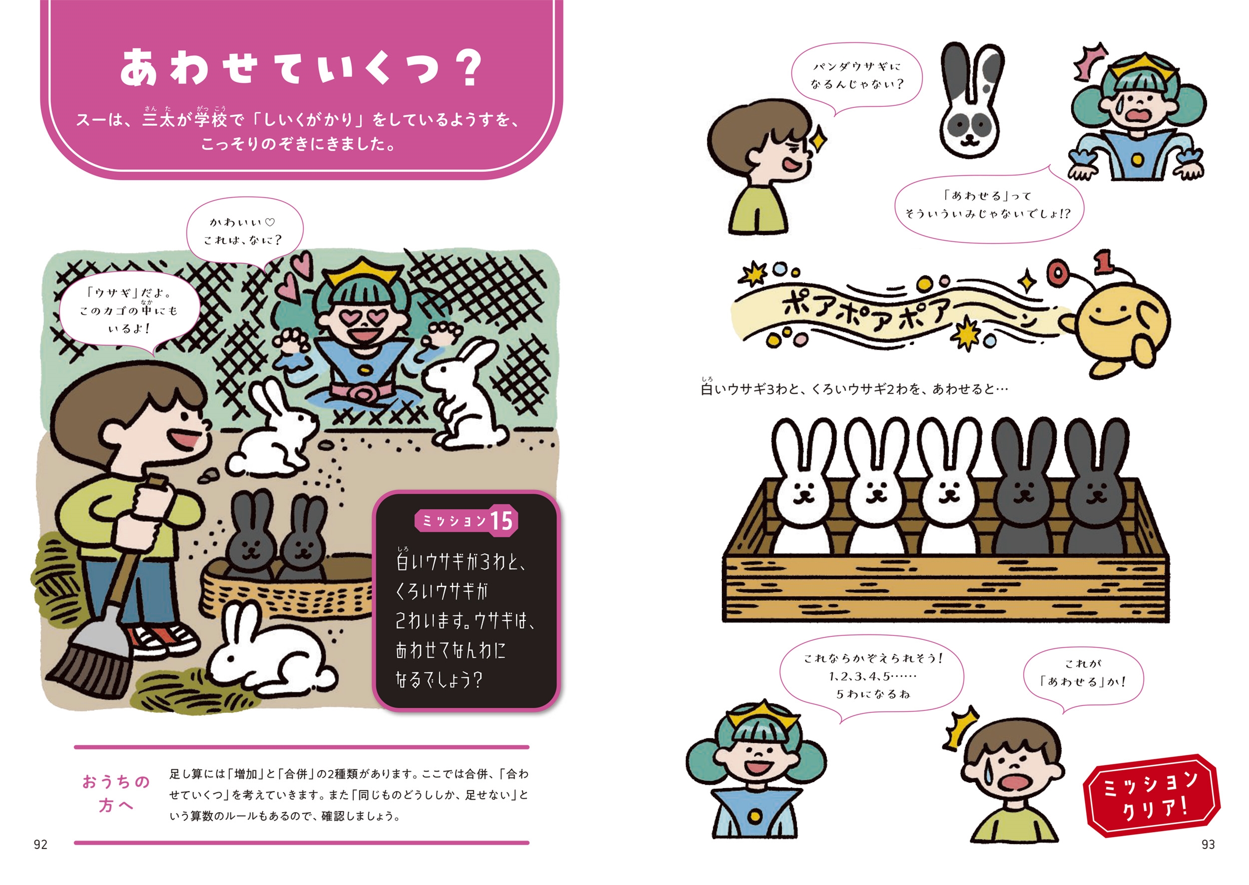本書では、主人公たちと一緒におこなうミッション形式で、算数の問題に取り組んでいきます。また「やってみよう!」コーナーでは手を動かしてイメージを育てます。宇宙人のスーと、小学生の三太、謎の生物ポアンと一緒に、ミッションを楽しく解きながら、算数を学びましょう。