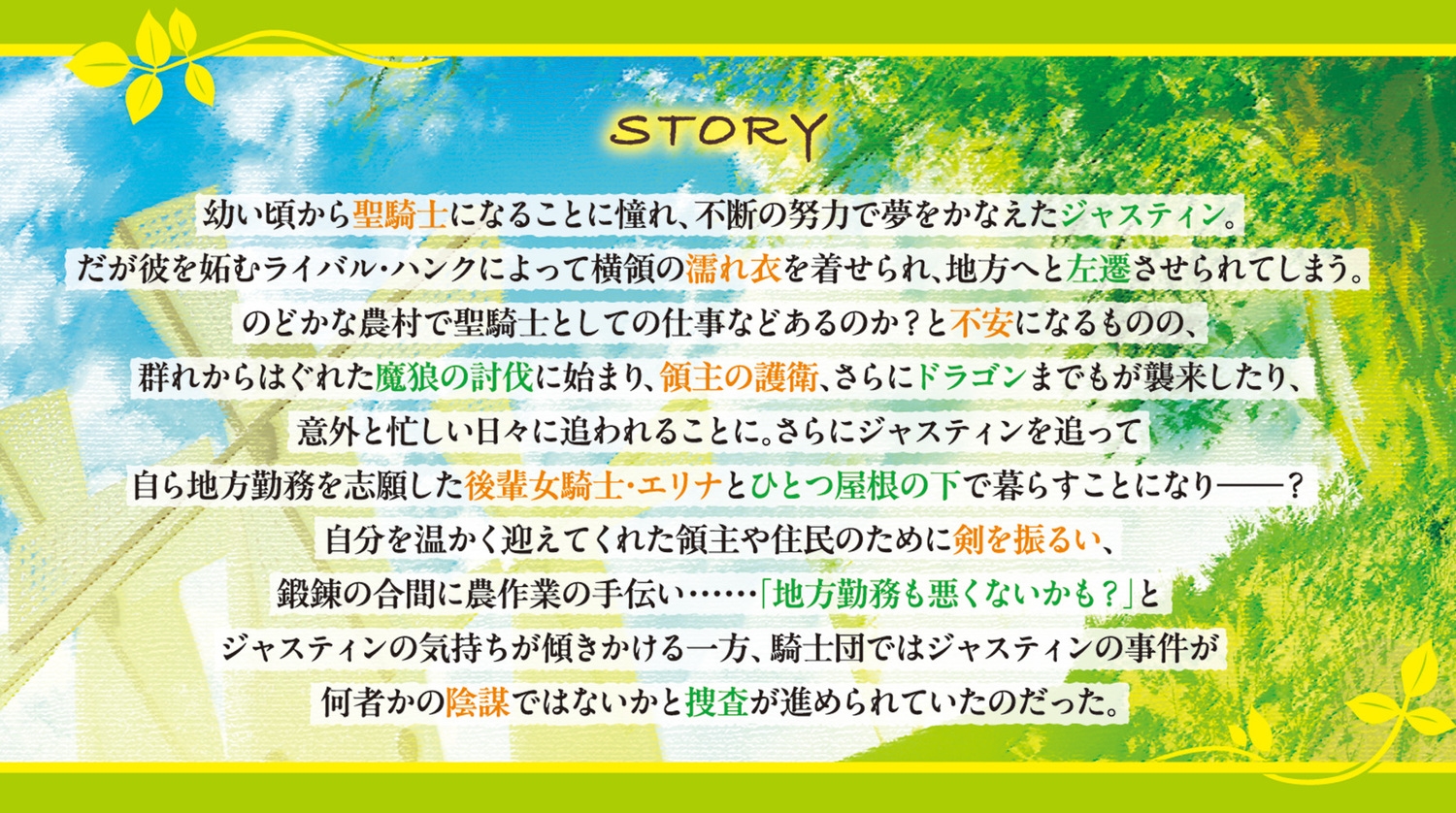 のどかな農村で聖騎士としての仕事などあるのか?と不安になるものの、群れからはぐれた魔狼の討伐に始まり、領主の護衛、さらにドラゴンまでもが襲来したり、意外と忙しい日々に追われることに。さらにジャスティンを追って自ら地方勤務を志願した後輩女騎士・エリナとひとつ屋根の下で暮らすことになり――?