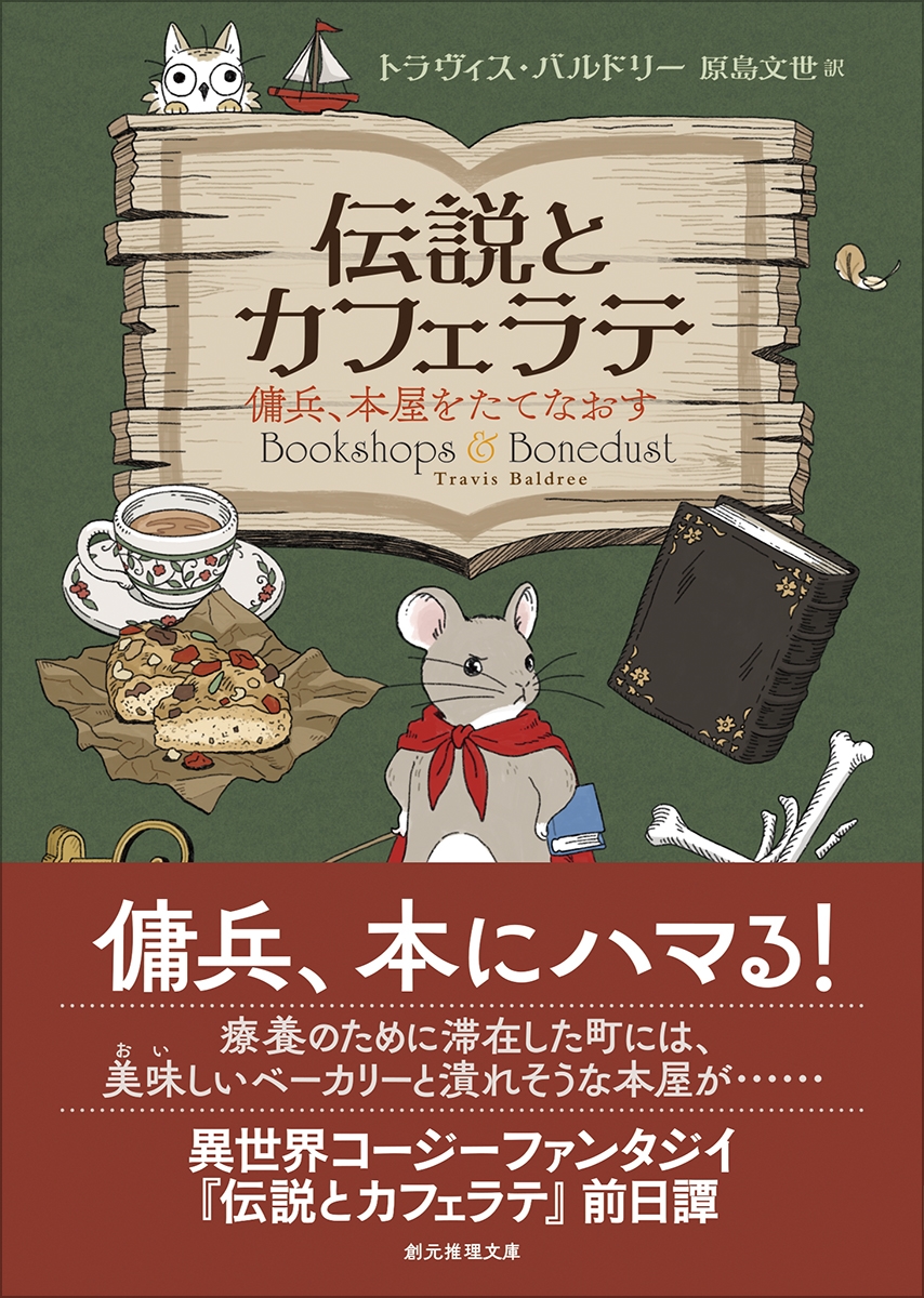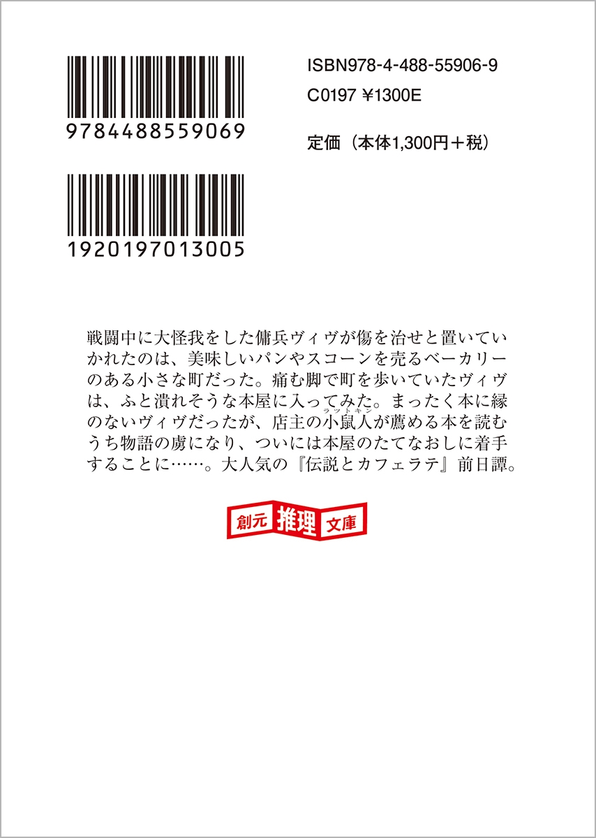 戦闘中に大怪我をした傭兵ヴィヴが傷を治せと置いていかれたのは、美味しいパンやスコーンを売るベーカリーのある小さな町だった。痛む脚で町を歩いていたヴィヴは、ふと潰れそうな本屋に入ってみた。まったく本に縁のないヴィヴだったが、店主の小鼠人(ラツトキン)が薦める本を読むうち物語の虜になり、ついには本屋のたてなおしに着手することに……。大人気の『伝説とカフェラテ』前日譚。