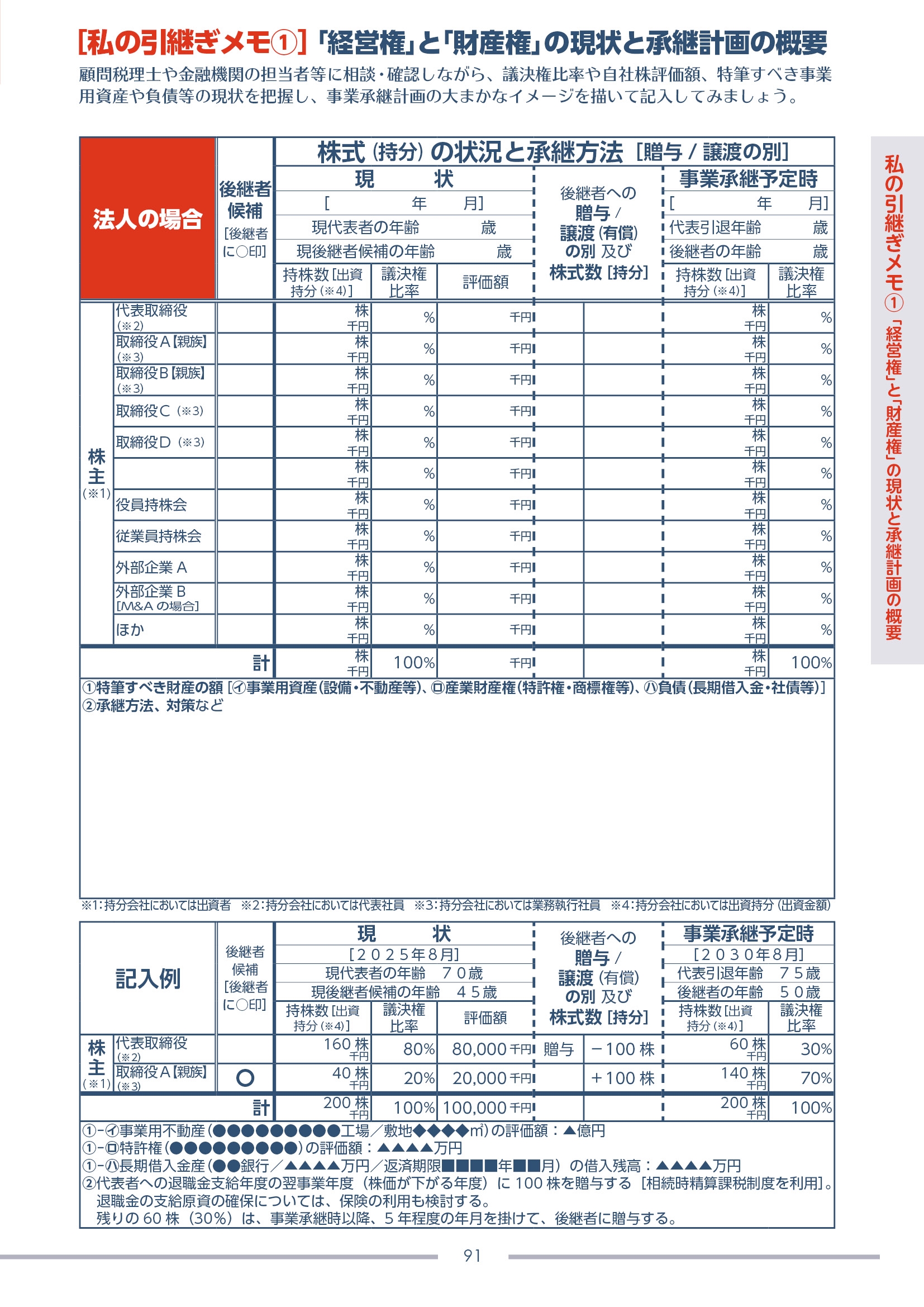 ◎オーナーの保有財産や株式等の状況、承継計画の大まかなイメージを記入できるメモ欄も!