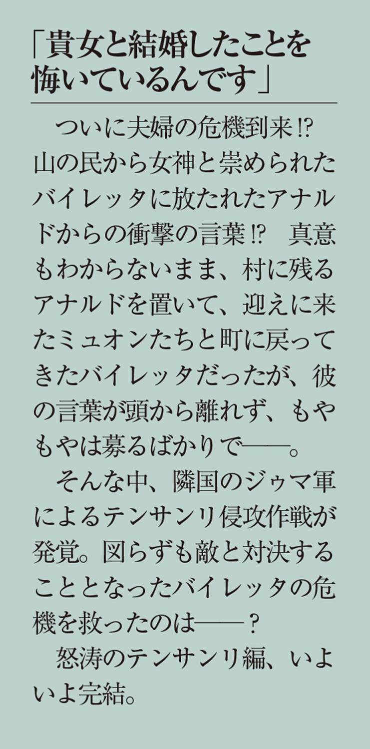 ついに夫婦の危機到来!? 山の民から女神と崇められたバイレッタに放たれたアナルドからの衝撃の言葉!? 真意もわからないまま、村に残るアナルドを置いて、迎えに来たミュオンたちと町に戻ってきたバイレッタだったが、彼の言葉が頭から離れず、もやもやは募るばかりで──。