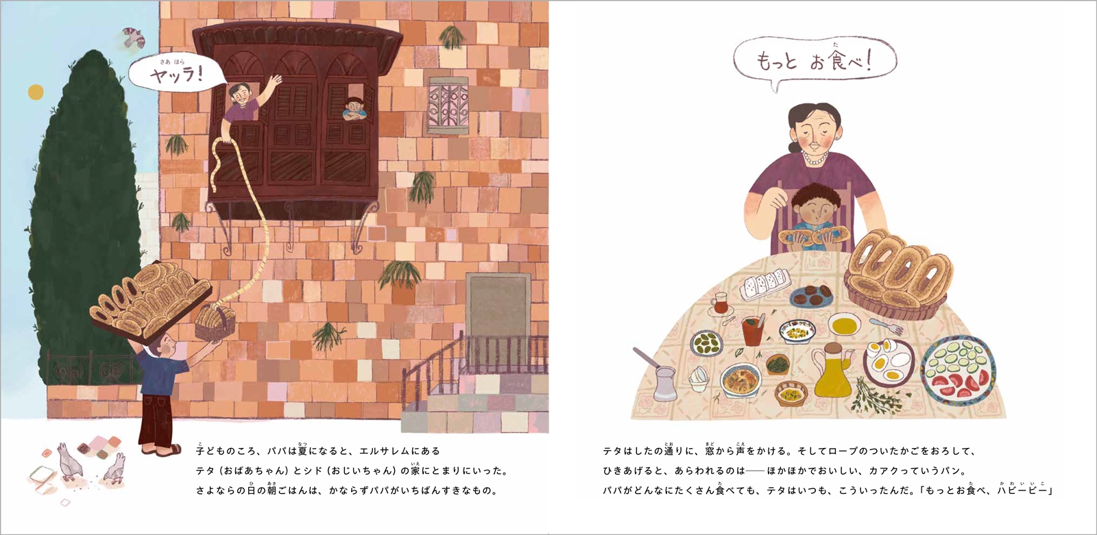 パパはねむるまえ、わたしたち3人に、いろんな話をしてくれる。遠くはなれたふるさと、パレスチナの話も。エルサレムの町のようす、いろんな音やにおい、そこに住んでいたひとびとのことーー。わたしたちは、一度も行ったことのないふるさとに、いつかもどりたいと願ってる。