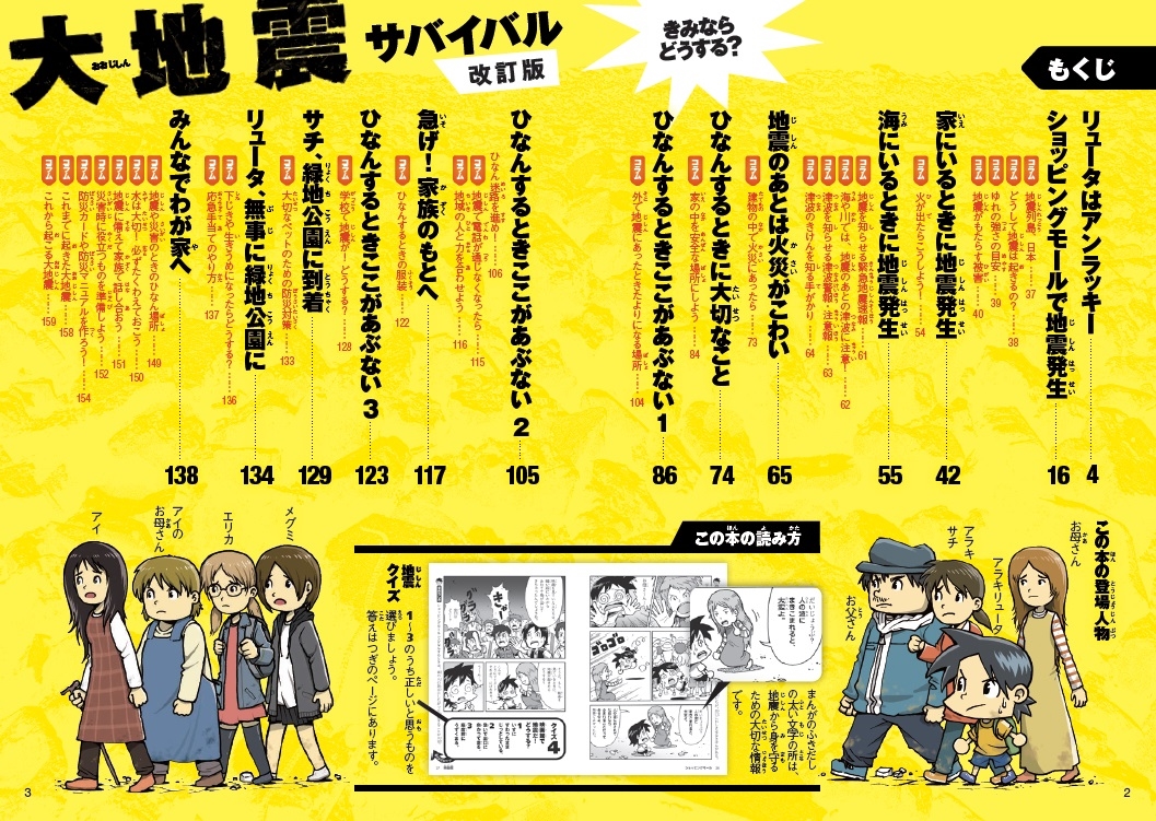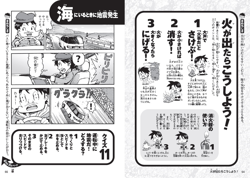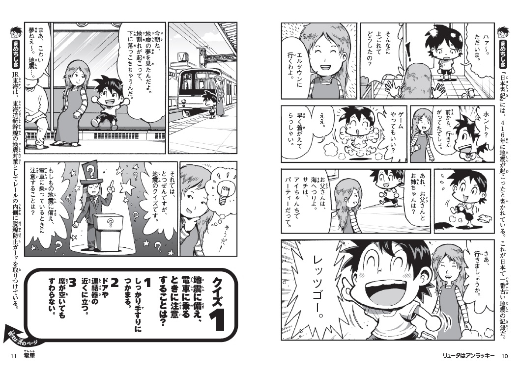 地震が起こったとき、どのように行動すればよいのか、マンガとクイズで学べます。