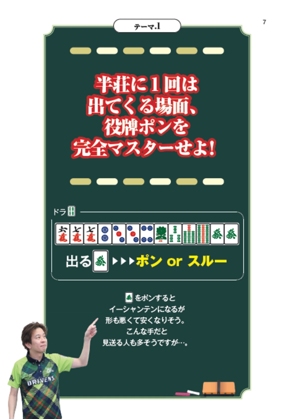 麻雀を打っていてよく出る迷う場面を牌譜をもとに解説。豊富な練習問題を解くことで実戦でも使えるようになります。