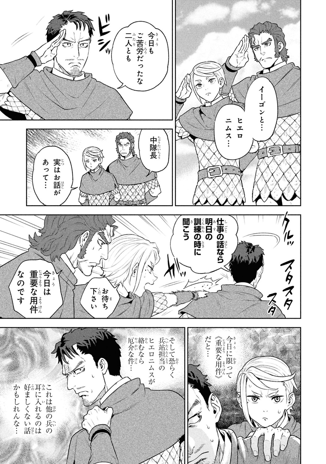 古都の衛兵隊中隊長・ベルトホルトは部下のイーゴンとヒエロニムスにとある相談を持ちかけられる。衛兵隊の将来を担う二人が揃っての相談に警戒するベルトホルトだが、その内容は――。