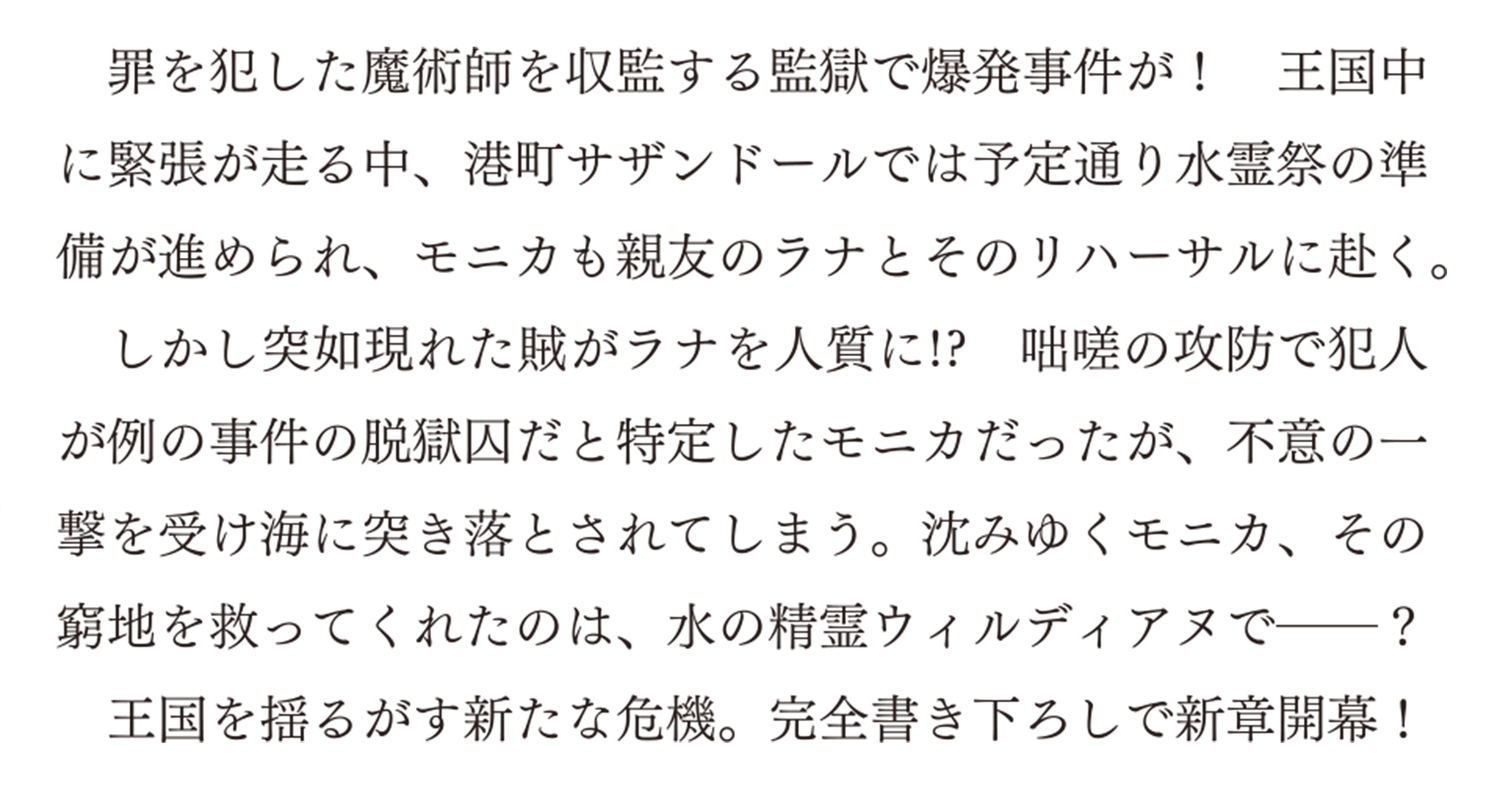 咄嗟の攻防で犯人が例の事件の脱獄囚だと特定したモニカだったが、不意の一撃を受け海に突き落とされてしまう。沈みゆくモニカ、その窮地を救ってくれたのは、水の精霊ウィルディアヌで――?