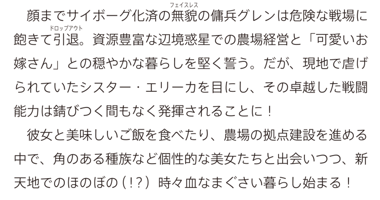 顔までサイボーグ化済の無貌(フェイスレス)の傭兵グレンは危険な戦場に飽きて引退(ドロップアウト)。資源豊富な辺境惑星での農場経営と「可愛いお嫁さん」との穏やかな暮らしを堅く誓う。だが、現地で虐げられていたシスター・エリーカを目にし、その卓越した戦闘能力は錆びつく間もなく発揮されることに!