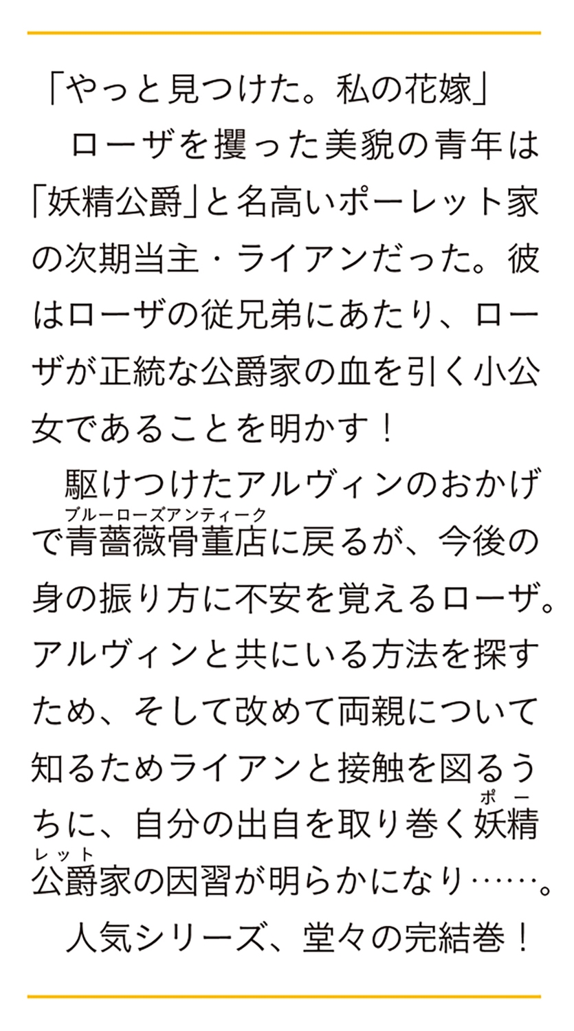 駆けつけたアルヴィンのおかげで一時は青薔薇骨董店に戻るが、今後の身の振り方に不安を覚えるローザ。アルヴィンと共にいる方法を探すため、そして改めて両親について知るため、アルヴィンとともに妖精公爵家へ接触を図るうちに、ローザの出自を取り巻く妖精公爵家の因習が明らかになっていき……。