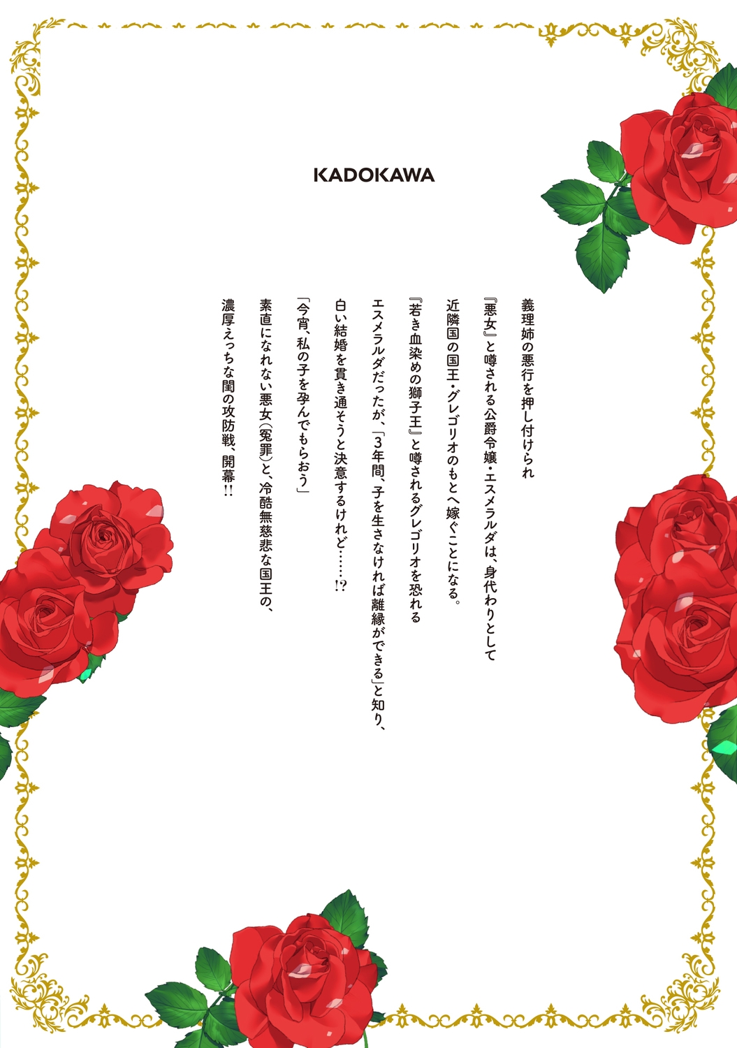 義理姉の悪行を押し付けられ「悪女」と噂される公爵令嬢・エスメラルダは、身代わりとして近隣国の国王・グレゴリオのもとに嫁ぐことになる。