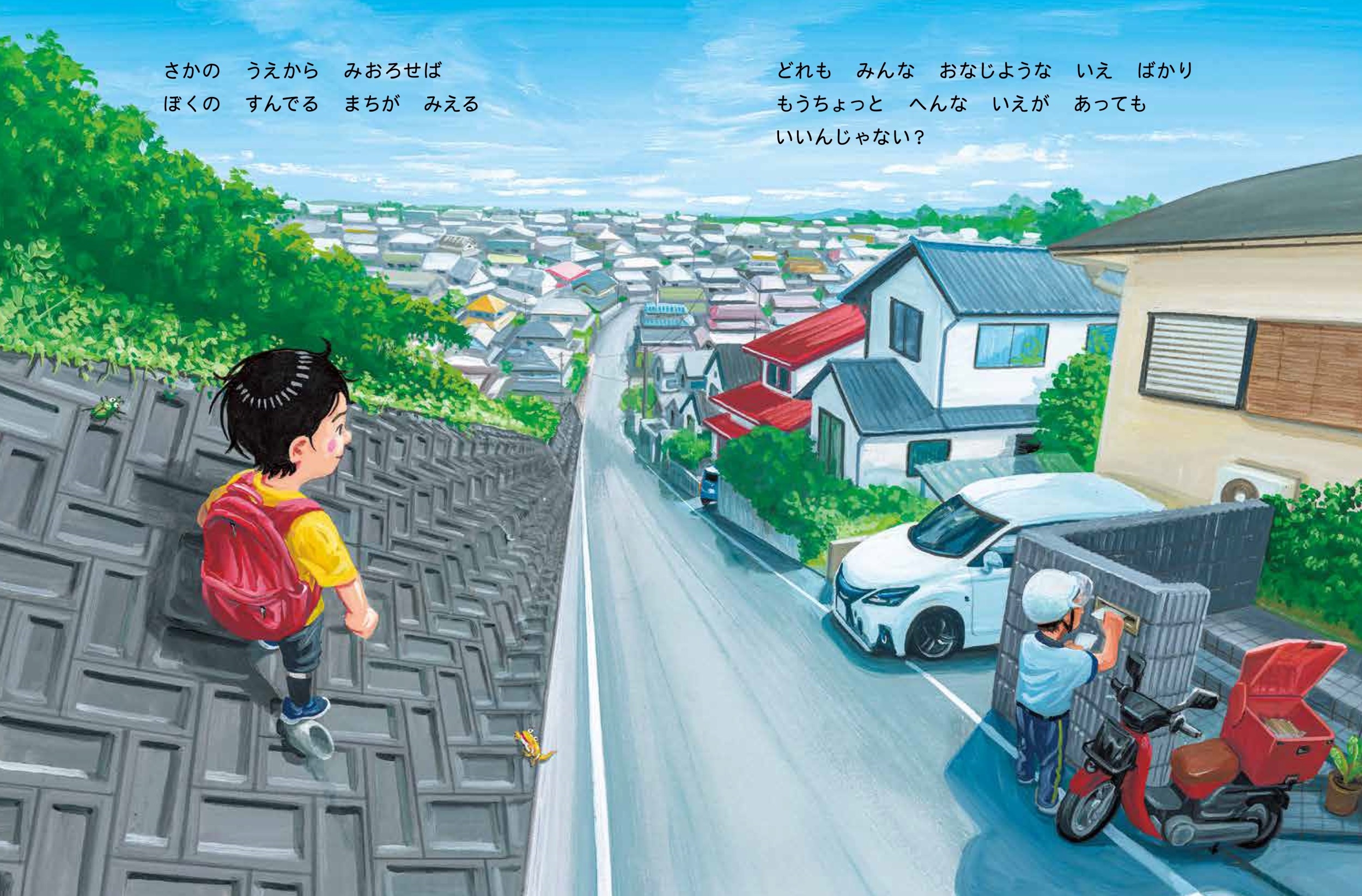 坂の上からみおろせば、ぼくのすんでる町がみえる。どれもみんなおなじようないえばかり。もうちょっとへんないえがあってもいいんじゃない?