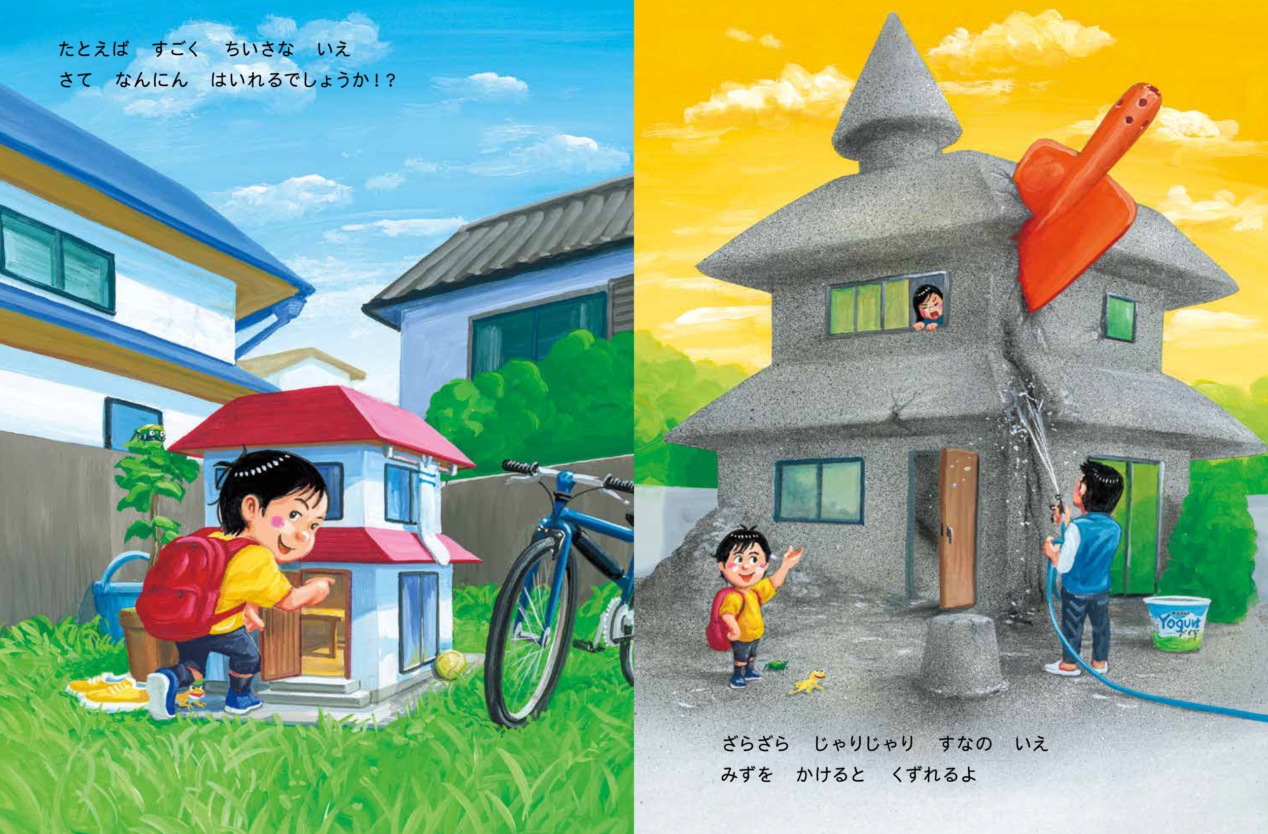 たとえば、水をかけるとくずれる「すなのいえ」や、引っこしするときにころがせる「まるいいえ」があったらたのしそう。