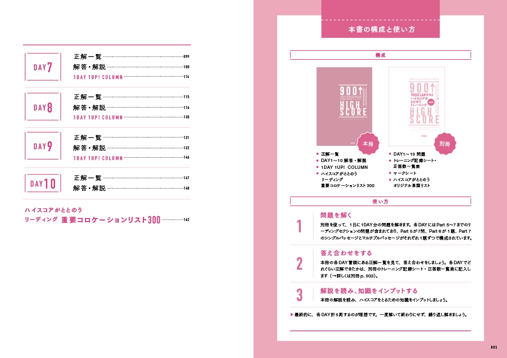 解説編:正解一覧、DAY1~10解答・解説、1DAY 1UP! COLUMN、ハイスコアがととのうリーディング重要コロケーションリスト300を収録。