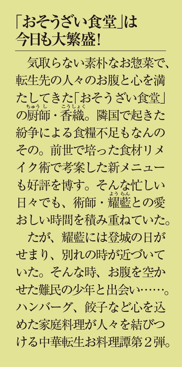 気取らない素朴なお惣菜で、転生先の人々のお腹と心を満たしてきた「おそうざい食堂」の厨師・香織。隣国で起きた 紛争による食糧不足もなんのその。前世で培った食材リメイク術で考案した新メニューも好評を博す。そんな忙しい日々でも、術師・耀藍との愛おしい時間を積み重ねていた。