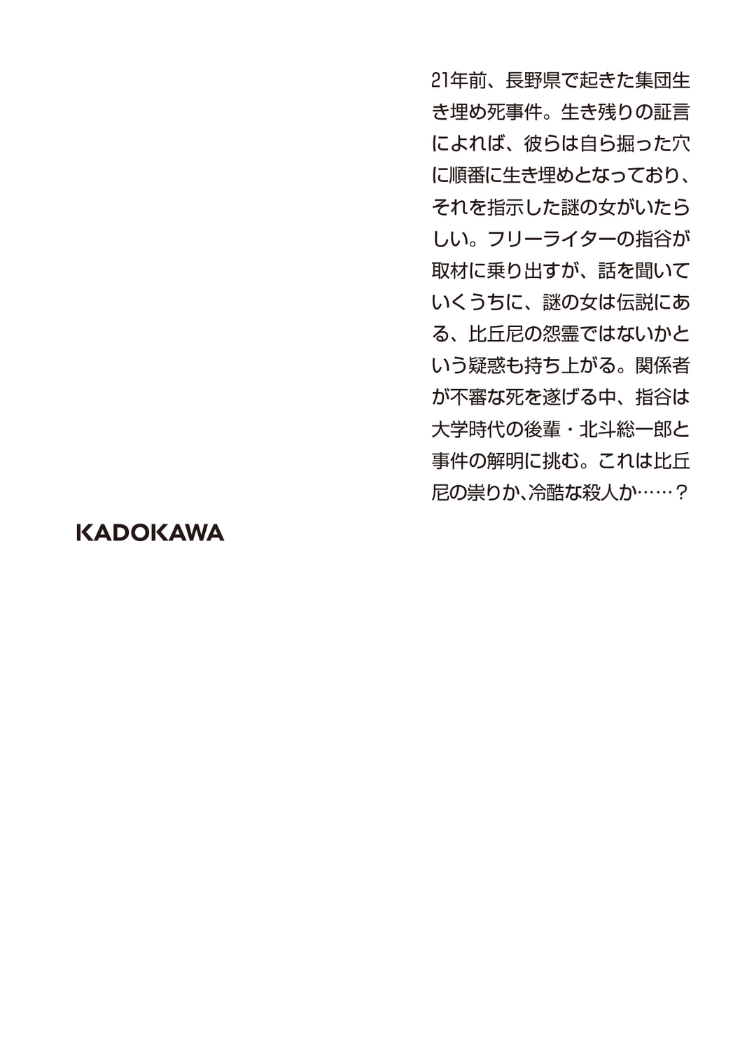 21年前、長野県で起きた集団生き埋め死事件。生き残りの証言によれば、彼らは自ら掘った穴に順番に生き埋めとなっており、それを指示した謎の女がいたらしい。フリーライターの指谷が取材に乗り出すが、話を聞いていくうちに、謎の女は伝説にある、比丘尼の怨霊ではないかという疑惑も持ち上がる。関係者が不審な死を遂げる中、指谷は大学時代の後輩・北斗総一郎と事件の解明に挑む。これは比丘尼の祟りか、冷酷な殺人か?