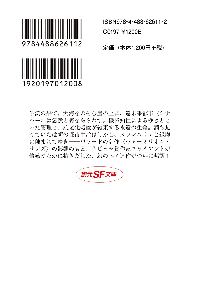 砂漠の果て、大海をのぞむ崖の上に、遠未来都市〈シナバー〉は忽然と姿をあらわす。機械知性によるゆきとどいた管理と、抗老化処置が約束する永遠の生命。満ち足りていたはずの都市生活はしかし、メランコリアと退廃に蝕まれてゆき──バラードの名作〈ヴァーミリオン・サンズ〉の影響のもと、ネビュラ賞作家ブライアントが情感ゆたかに描きだした、幻のSF連作がついに邦訳! 著者序文=エドワード・ブライアント/解説=大野万紀