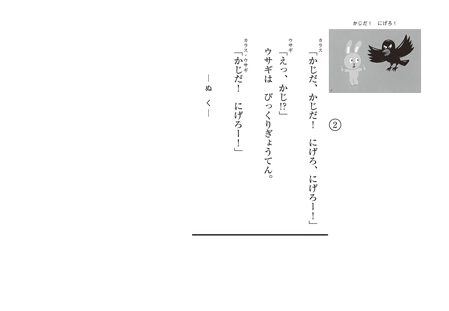 カラスさんがにげていると、なわとびをしているウサギさんにであいました。