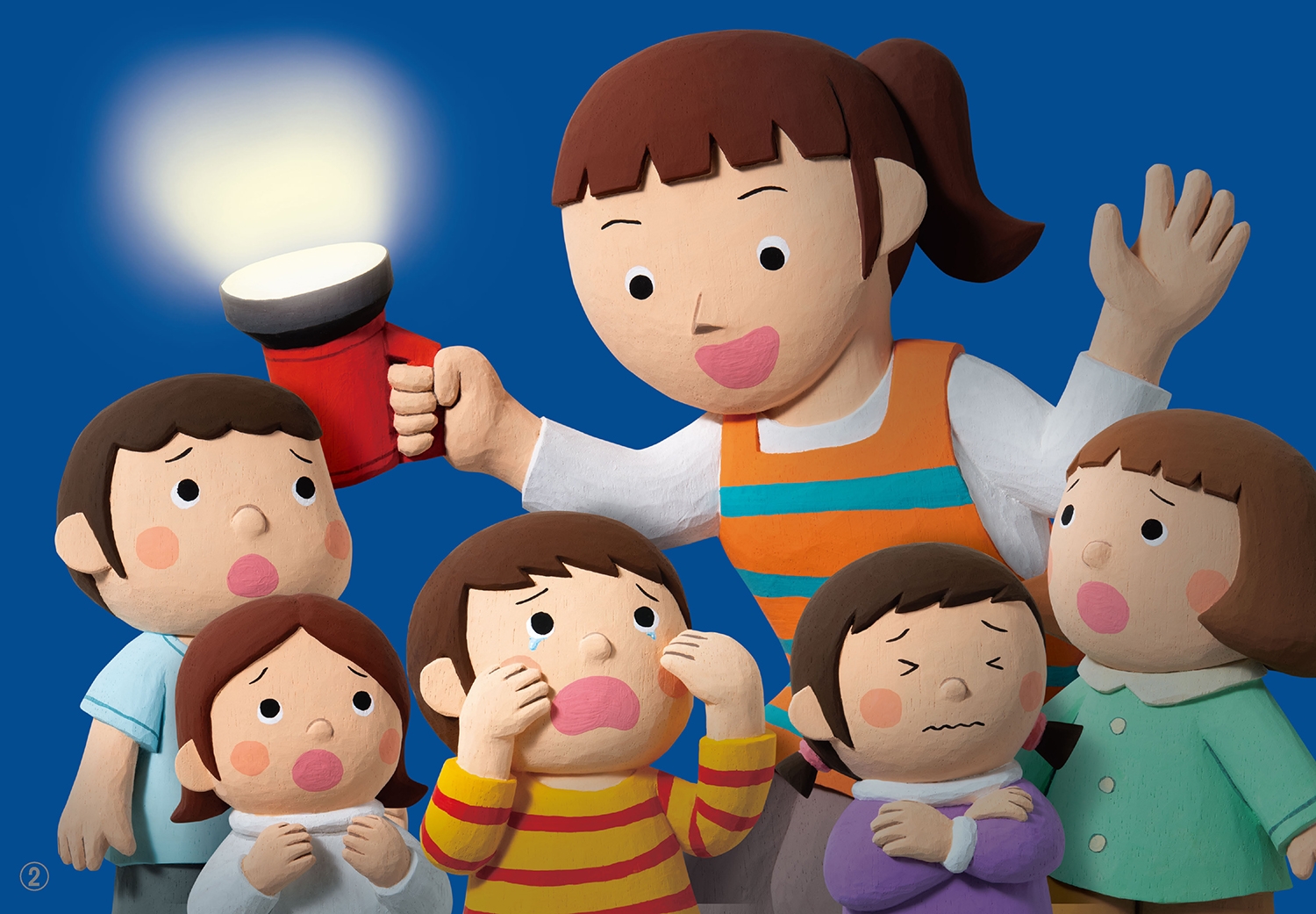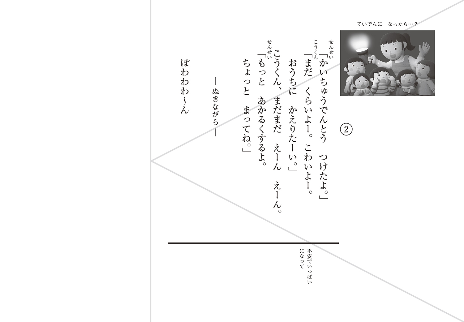「わあ、まっくら!」こうくんはびっくりして、えーんえーん。すぐに先生がきて懐中電灯をつけてくれました。