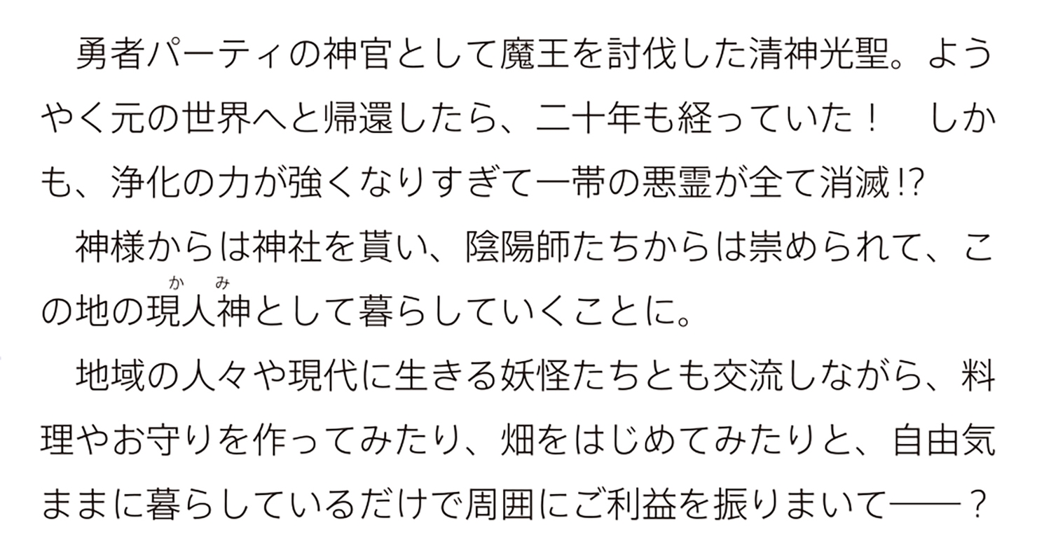 勇者パーティの神官として魔王を討伐した清神光聖。ようやく元の世界へと帰還したら、二十年も経っていた!