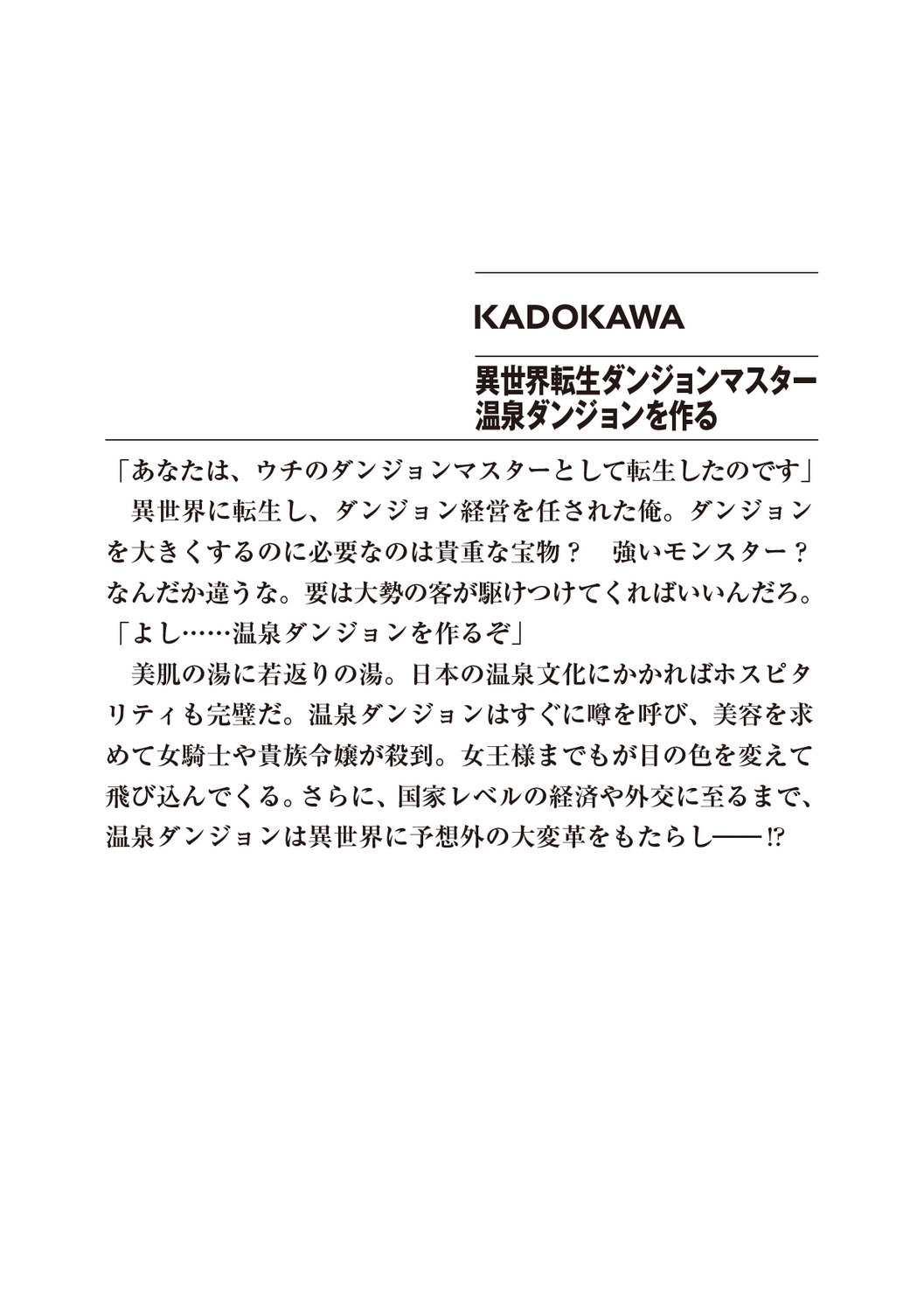 さらに、国家レベルの経済や外交に至るまで、温泉ダンジョンは異世界に予想外の大変革をもたらし――!?