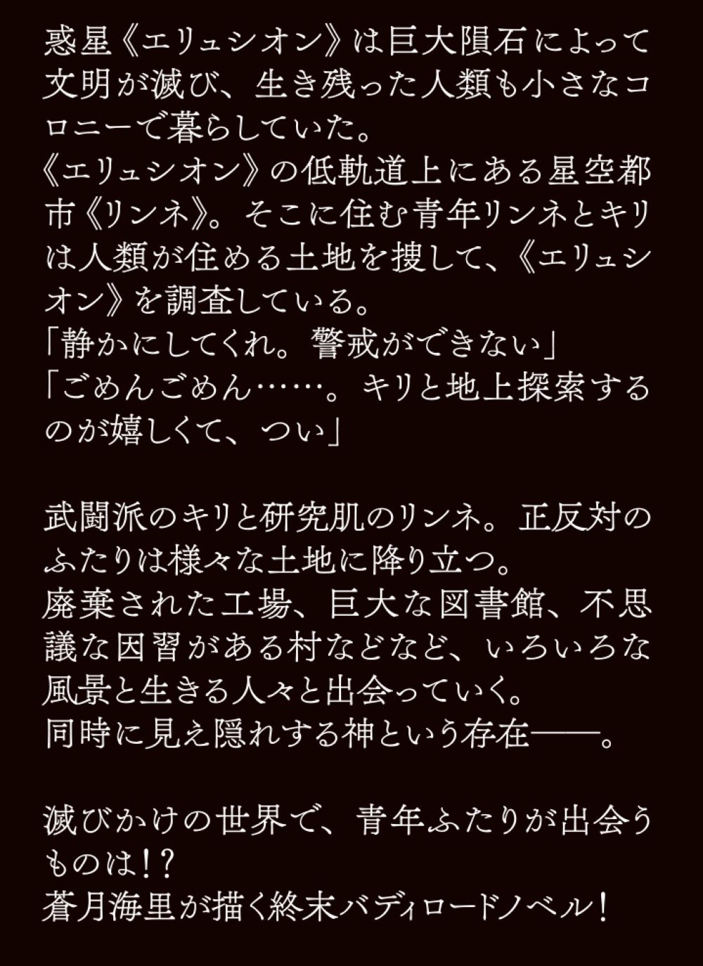 《エリュシオン》の低軌道上にある星空都市《リンネ》。そこに住む青年リンネとキリは人類が住める土地を捜して、《エリュシオン》を調査している。