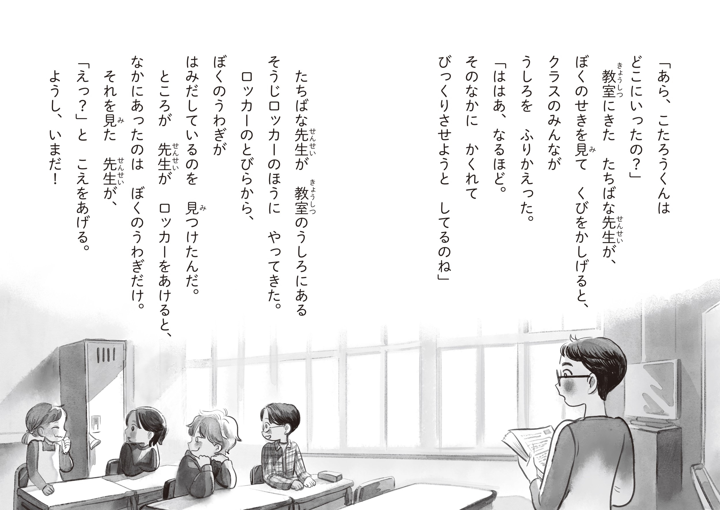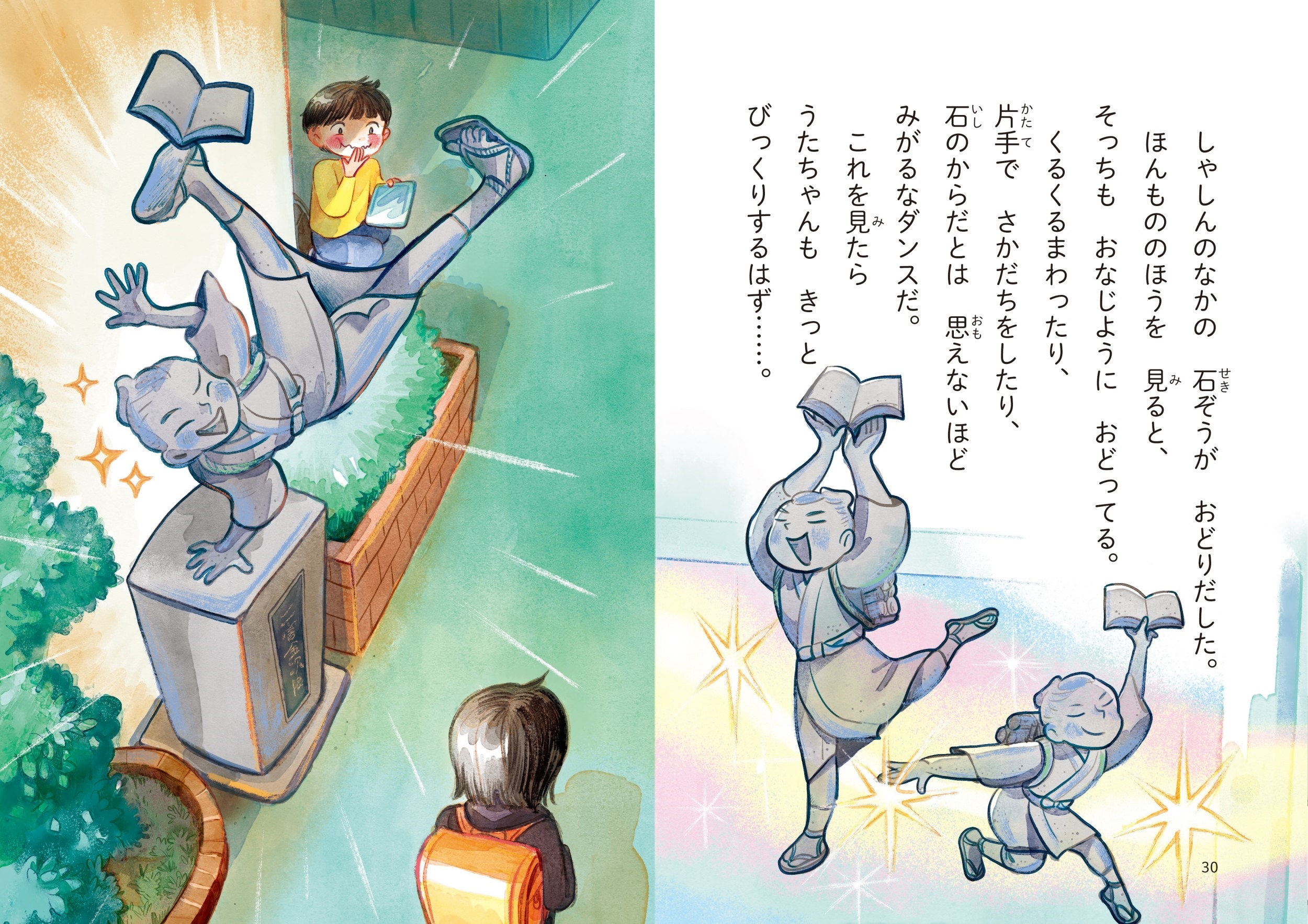 いつもつまらなさそうな顔をしている、転校生のうたちゃん。いたずら好きのこたろうは、ふしぎなアプリ『アブラカタブレット』を使って、うたちゃんにいたずらを仕掛けます。学校の石ぞうを躍らせたり、チョークをトンボにして飛ばしたり、ろうかを氷の床にしたり……。しかし、うたちゃんはどのいたずらにも気づいてくれず、地面を見つめているばかりです。