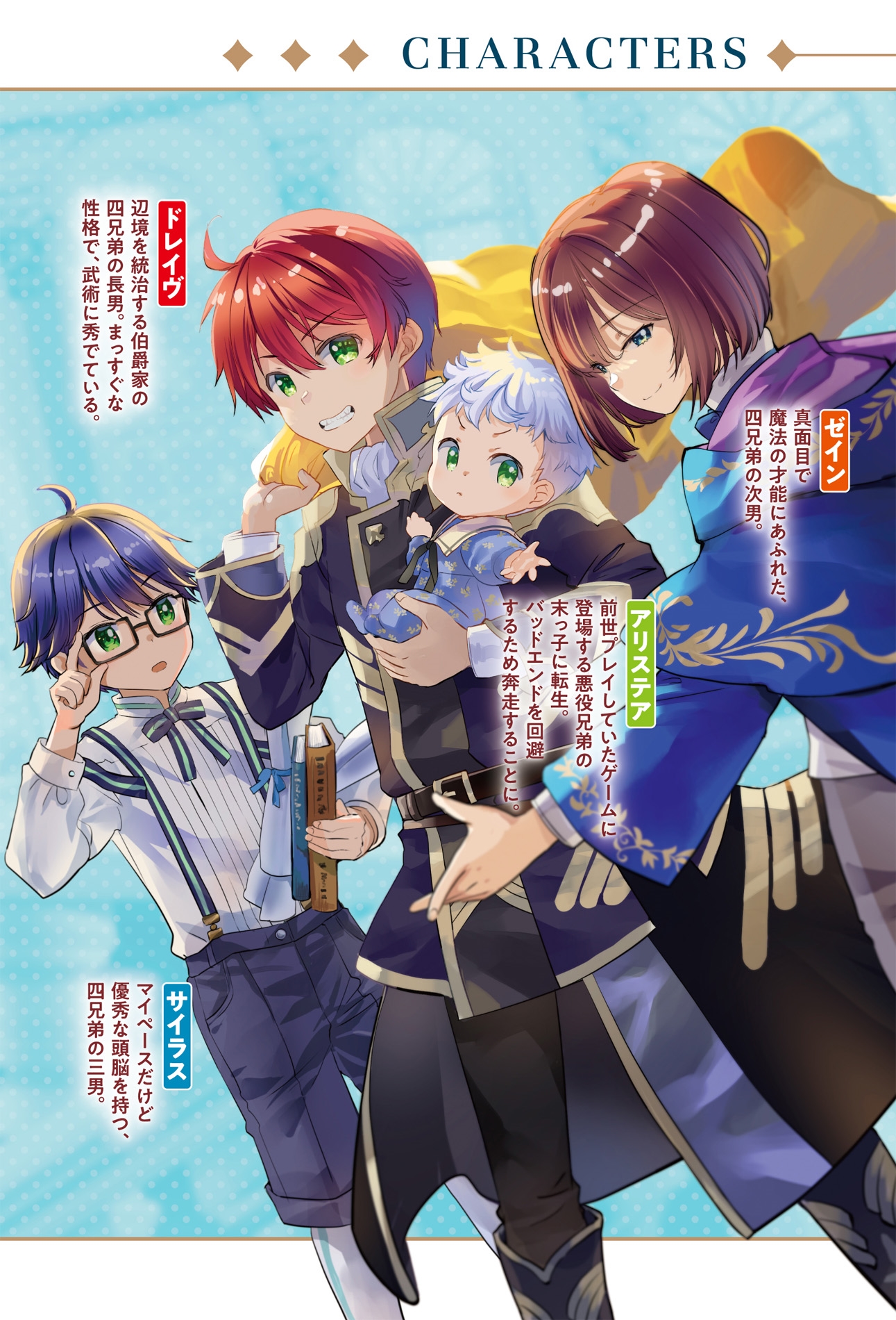 前世プレイしていたゲームに出てくる悪役兄弟の末っ子赤ちゃんに転生したアリステア。やさしい家族に愛され幸せをかみしめるが、原作では黒幕に操られたせいで一家丸ごと滅ぼされてしまうことを思い出す。なぜか本来ゲーム主人公が持つはずの「万能の力」を授かったアリステアは、家族の危機を救うため転生早々ひと肌脱ぐことに! スキルと前世知識をフル活用して、伝説の魔女や山奥に住む竜を手懐けたり、海の神獣を仲間にしたり…兄たちと協力して、徐々に黒幕を追い詰めていく。気づけば、原作でゲーム主人公が成し遂げるはずの成果まであげてしまっていて…!?