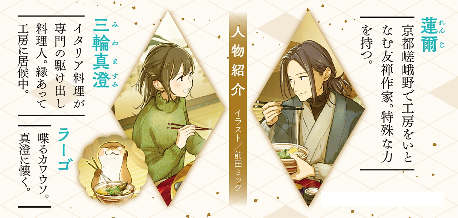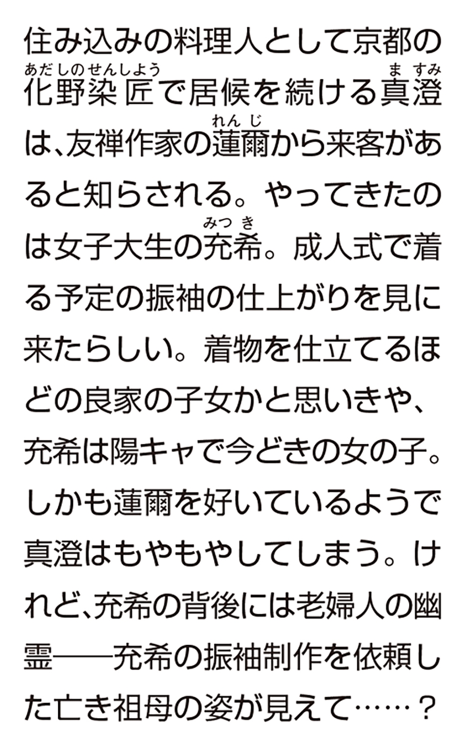 京都の化野染匠で居候を続ける元料理人の真澄は、友禅作家の蓮爾から来客があることを知らされる。やってきたのは女子大生の充希。成人式の振袖を依頼しており、その仕上がりを見に来たらしい。着物を仕立てるほどの良家の子女かと思いきや、充希は陽キャで今どきの女子大生。しかも蓮爾を好いているようで真澄はもやもやしてしまう。けれど、充希の背後には老婦人の幽霊――振袖を依頼した充希の亡き祖母の姿がみえて……?
