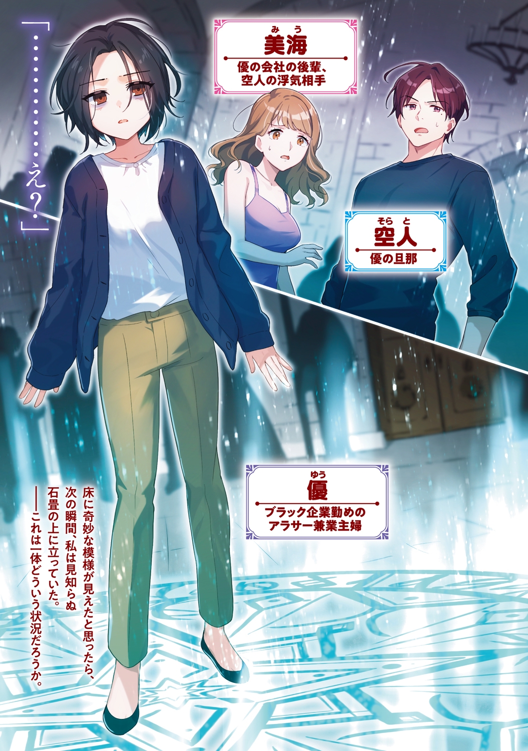 二十七歳会社員のユウは、ある日自宅で旦那の浮気現場に遭遇する。修羅場が繰り広げられる中、突然三人は異世界召喚され、旦那は『勇者()』、浮気相手は『せいじょ』、ユウは『主婦』と判定される。