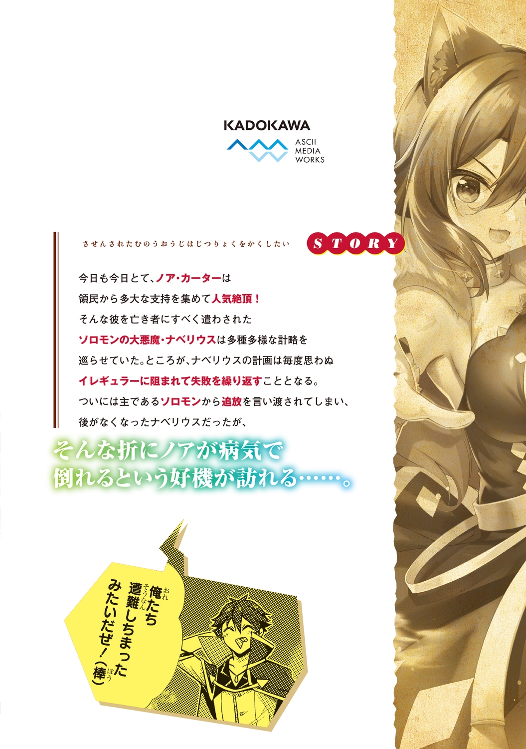 今日も今日とて、ノア・カーターは領民から多大な支持を集めて人気絶頂! そんな彼を亡き者にすべく遣わされたソロモンの大悪魔・ナベリウスが多種多様な計略を巡らせていた。ところが、ナベリウスの計画は毎度思わぬイレギュラーに阻まれて失敗を繰り返すこととなる。ついには主であるソロモンから追放を言い渡されてしまい、後がなくなったナベリウスだったが、そんな折にノアが病気で倒れるという好機が訪れる……。