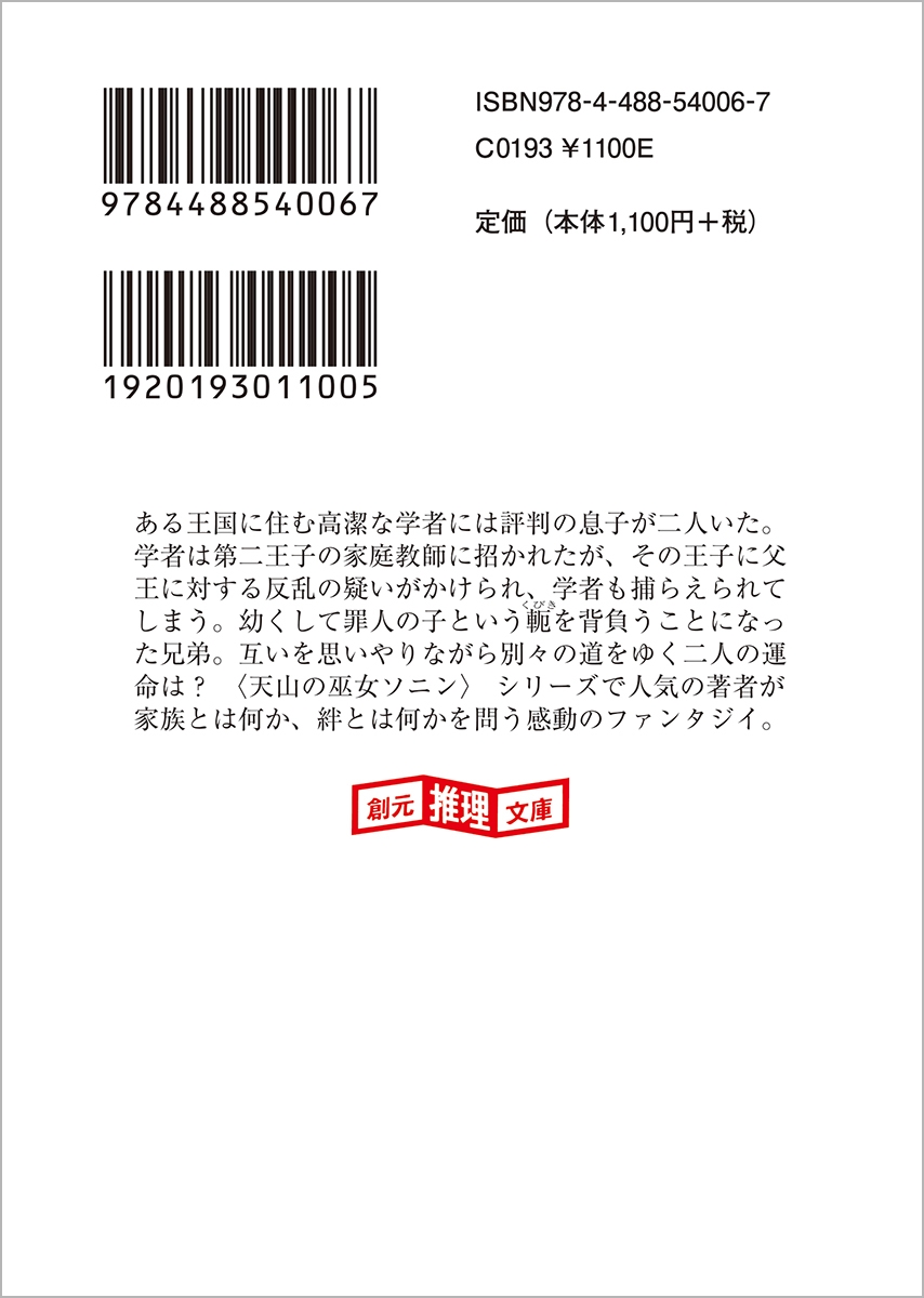 ある王国に住む高潔な学者には評判の息子が二人いた。学者は第二王子の家庭教師に招かれたが、その王子に父王に対する反乱の疑いがかけられ、学者も捕らえられてしまう。幼くして罪人の子という軛(くびき)を背負うことになった兄弟。互いを思いやりながら別々の道をゆく二人の運命は? 〈天山の巫女ソニン〉 シリーズで人気の著者が家族とは何か、絆とは何かを問う感動のファンタジイ。著者あとがき=菅野雪虫