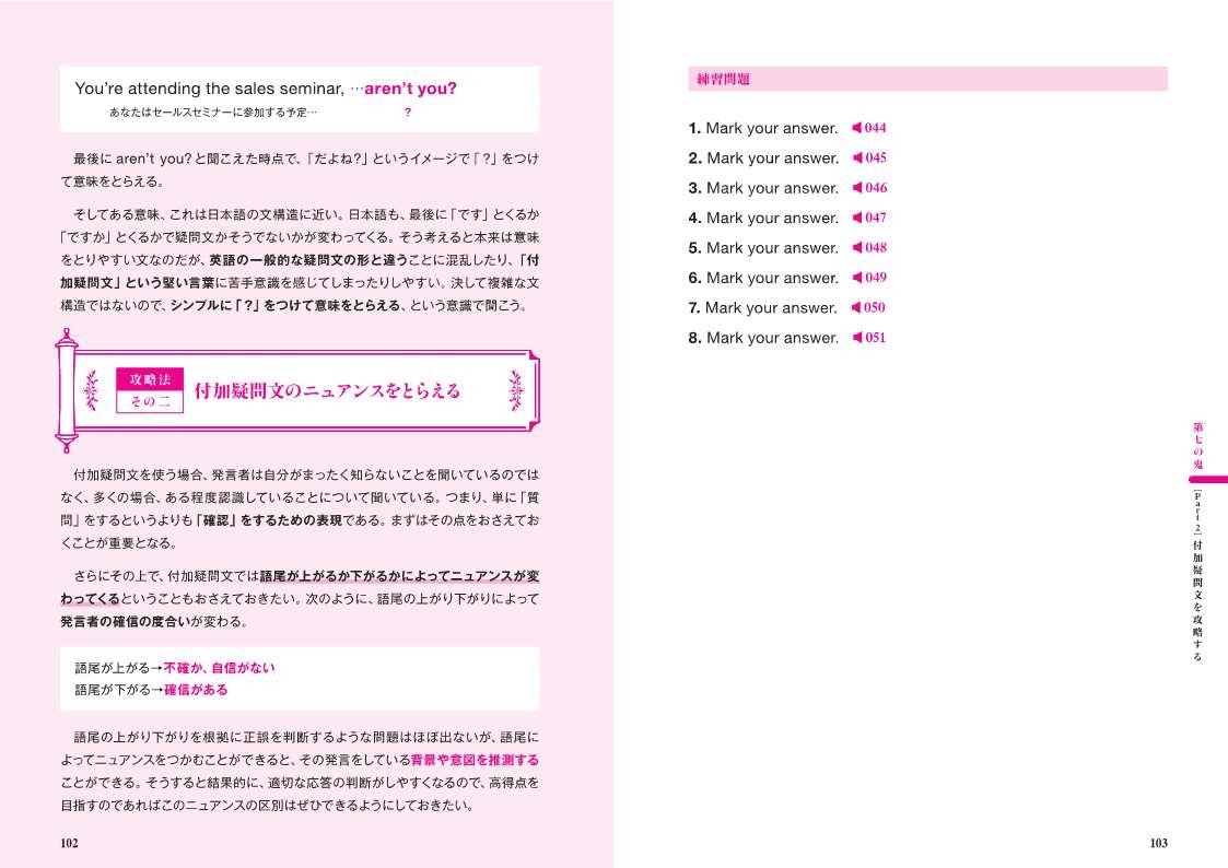 難化傾向にあるPart 1&2でハイスコアを奪取するには「高地トレーニング」が必要です。本書のすべてを攻略した上級者の皆さんのために、「模試~極鬼ver.」を2セット掲載しています。TVゲームでいう『Hardモード』。一見、一聴では同じ問題に思えるかもしれませんが、ノーマル模試にはなかった「鬼」がいたるところに潜む超難度の模試です。皆さんの挑戦をお待ちしています。