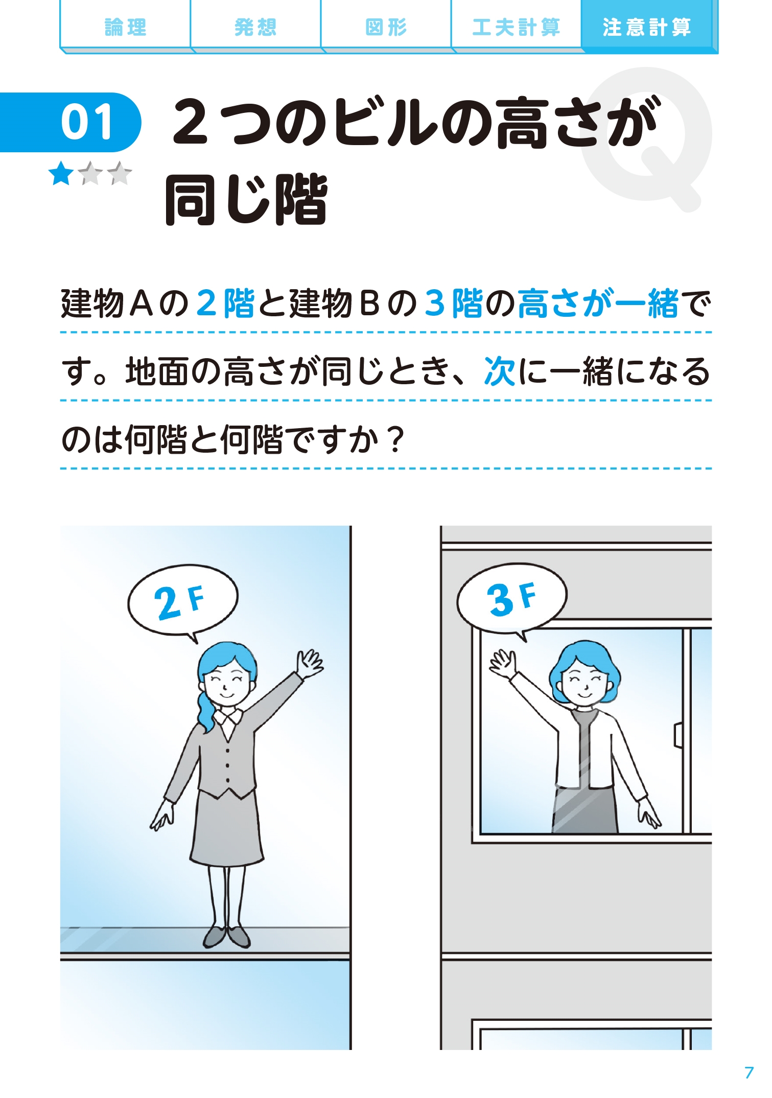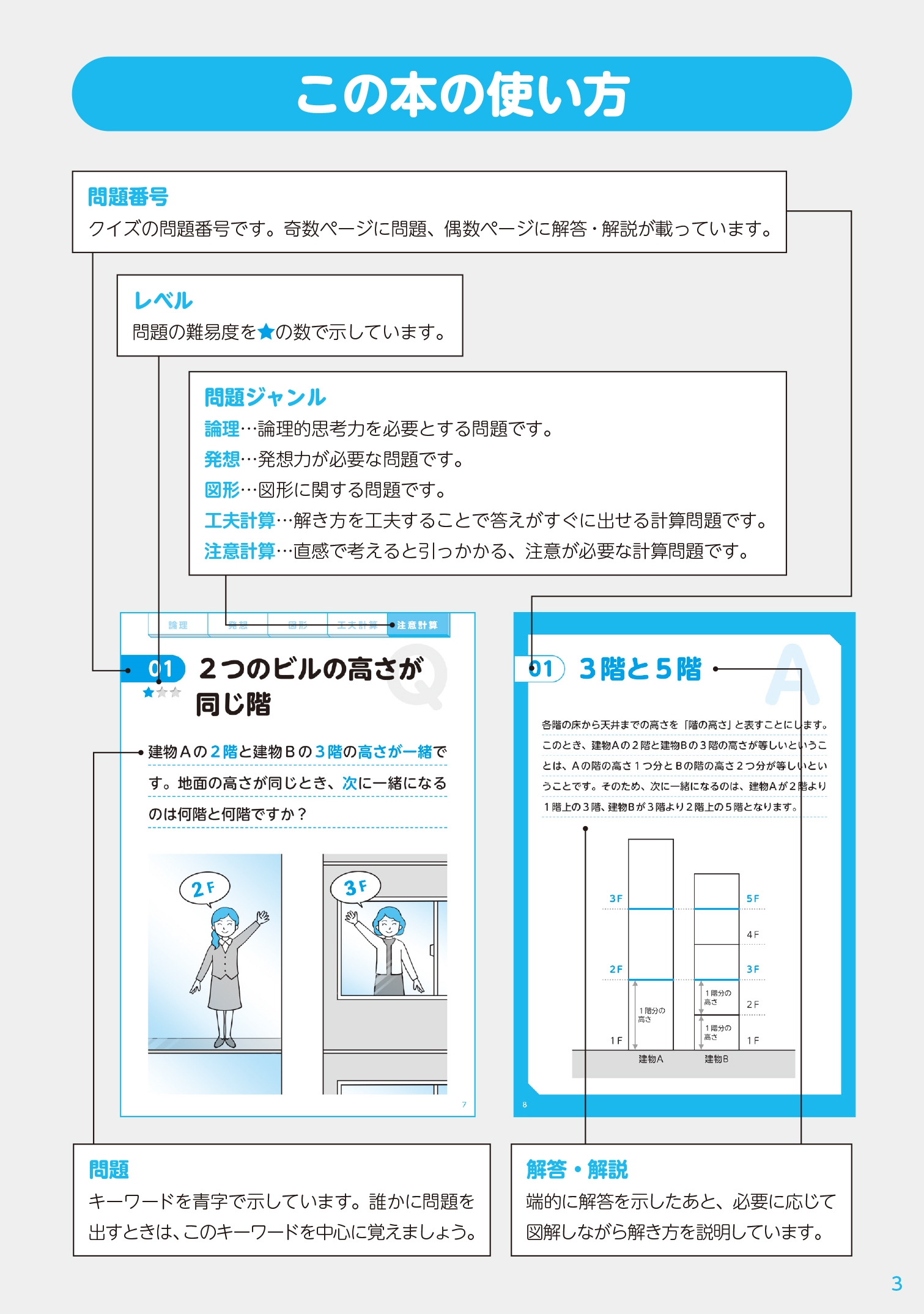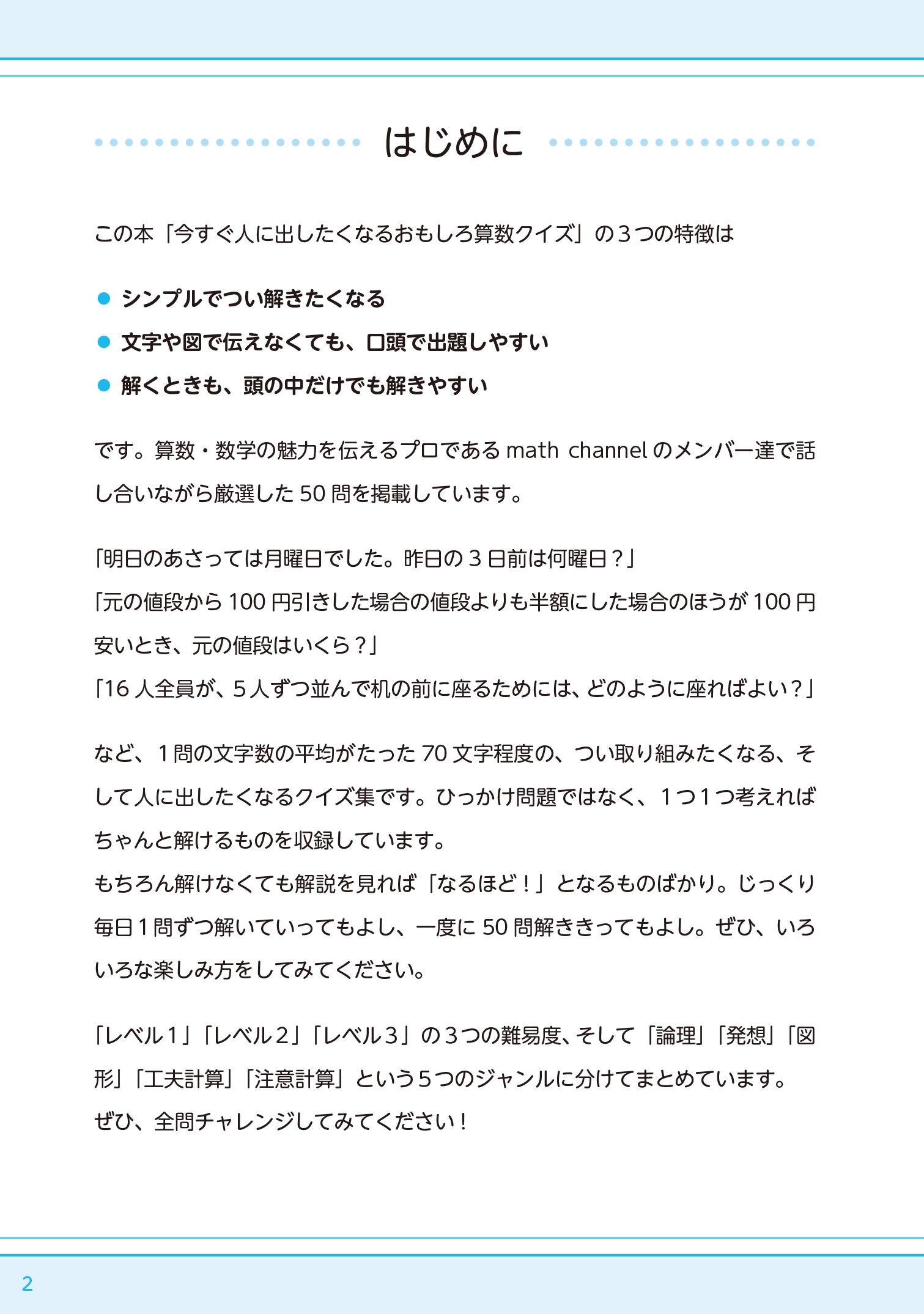 すべての問題で、複雑な計算はほとんど必要なく、よりわかりやすい考え方を見つけられれば小学生でも解くことができます。一方で、大人もつい引っかかるような計算問題もあり、子どもから大人まで誰でも楽しめます。