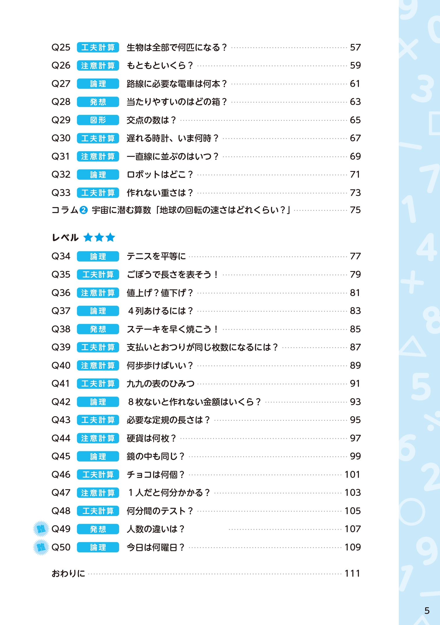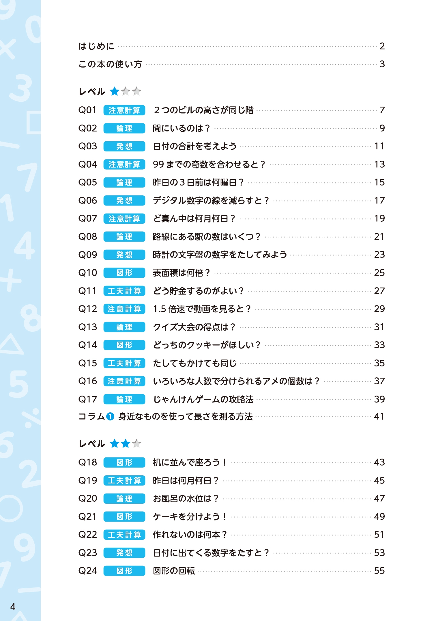 レベル1からレベル3の難易度順で、「論理」「発想」「図形」「工夫計算」「注意計算」の5つのジャンルに分けてまとめています。