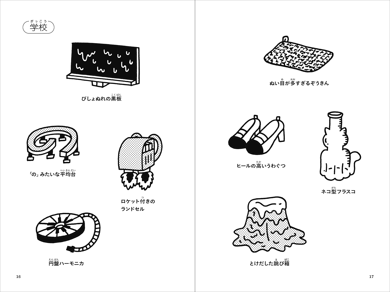 本来、図案帖は、つかいやすいさまざまなモチーフが掲載され、役に立つもの。しかし、とくに役に立たず使いにくい図案のみの図案帖があったら楽しいなとの思いつきからできました。登場するのは、異様に煙の出るテレビ、溶け出した跳び箱など、マネして描く機会のないものばかり。モヤモヤしたときや煮詰まったときの気分転換に、ながめてたのしい絵の本です。
