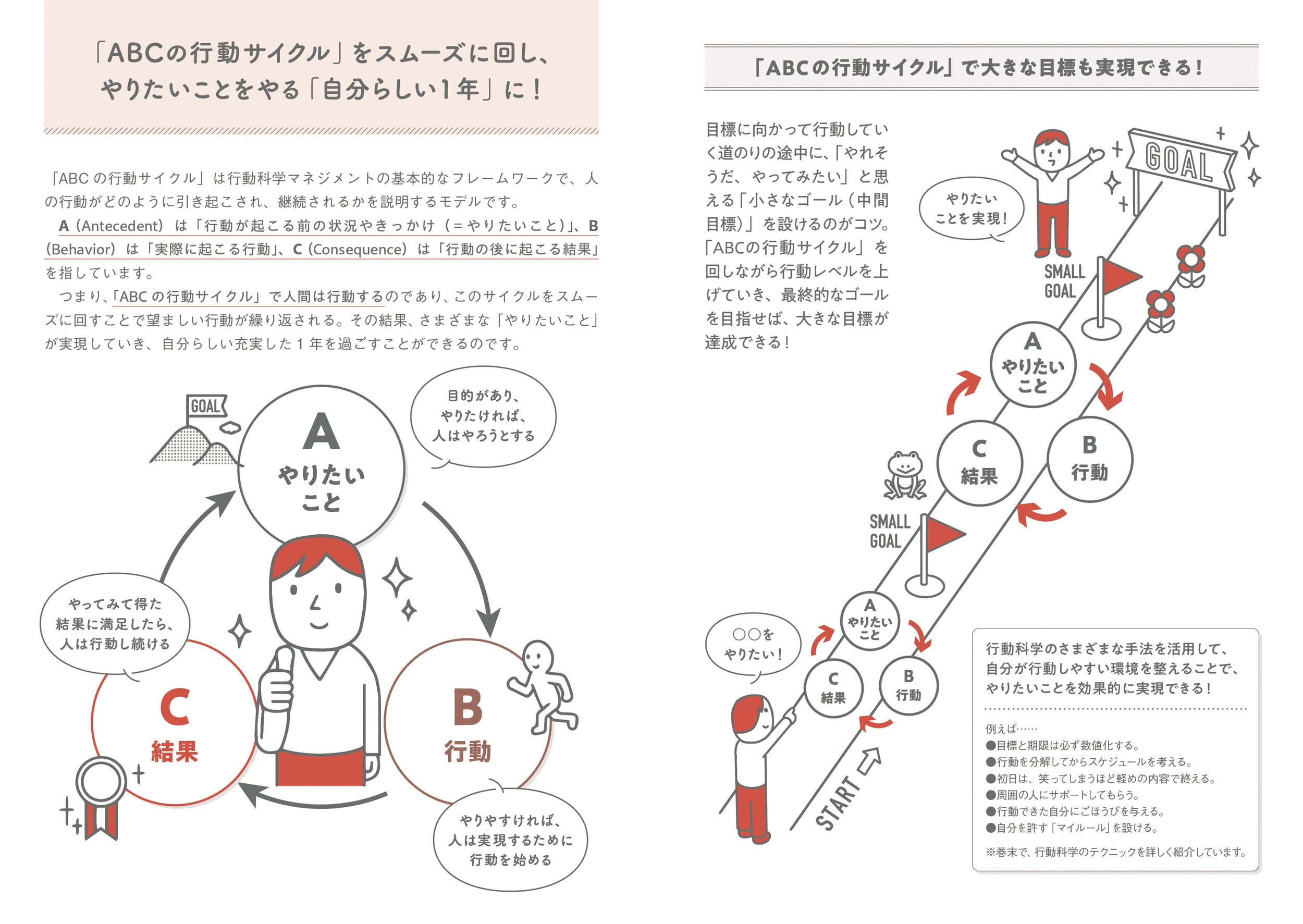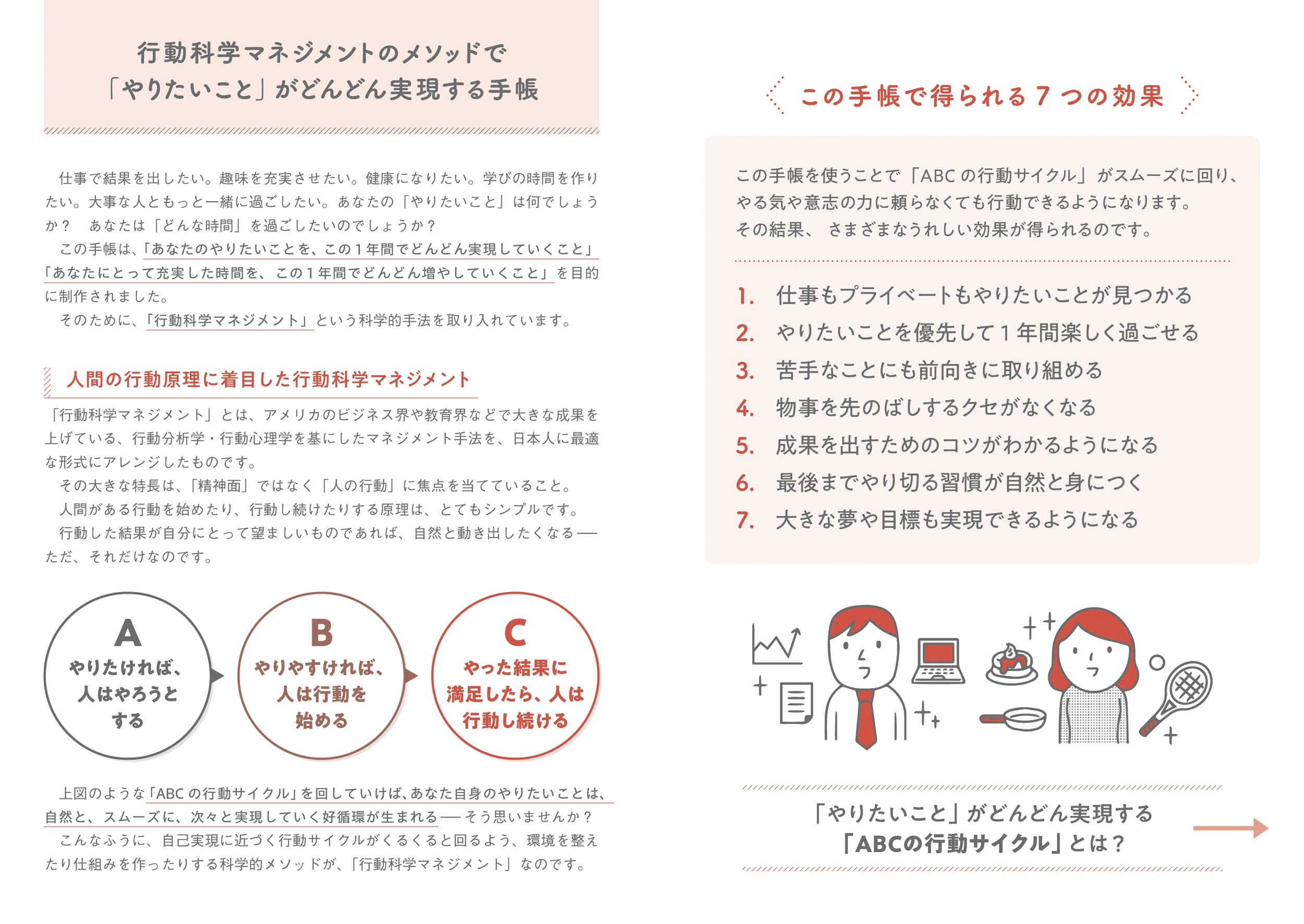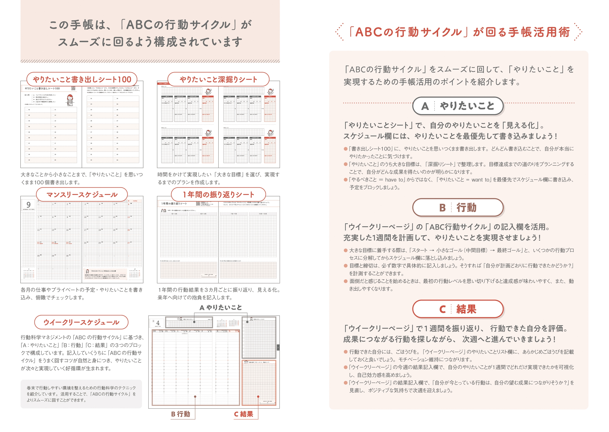アメリカのビジネス界や教育界などで大きな成果をあげている「行動科学マネジメント」のメソッドを盛り込んだ、「やりたいこと」を実現するためのビジネス手帳。行動科学マネジメントの基礎となる「ABC行動サイクル」がスムーズに回る3ブロック構成になっていて、書き込むだけで自発的な行動が促され、目標達成力がどんどん高まります。
