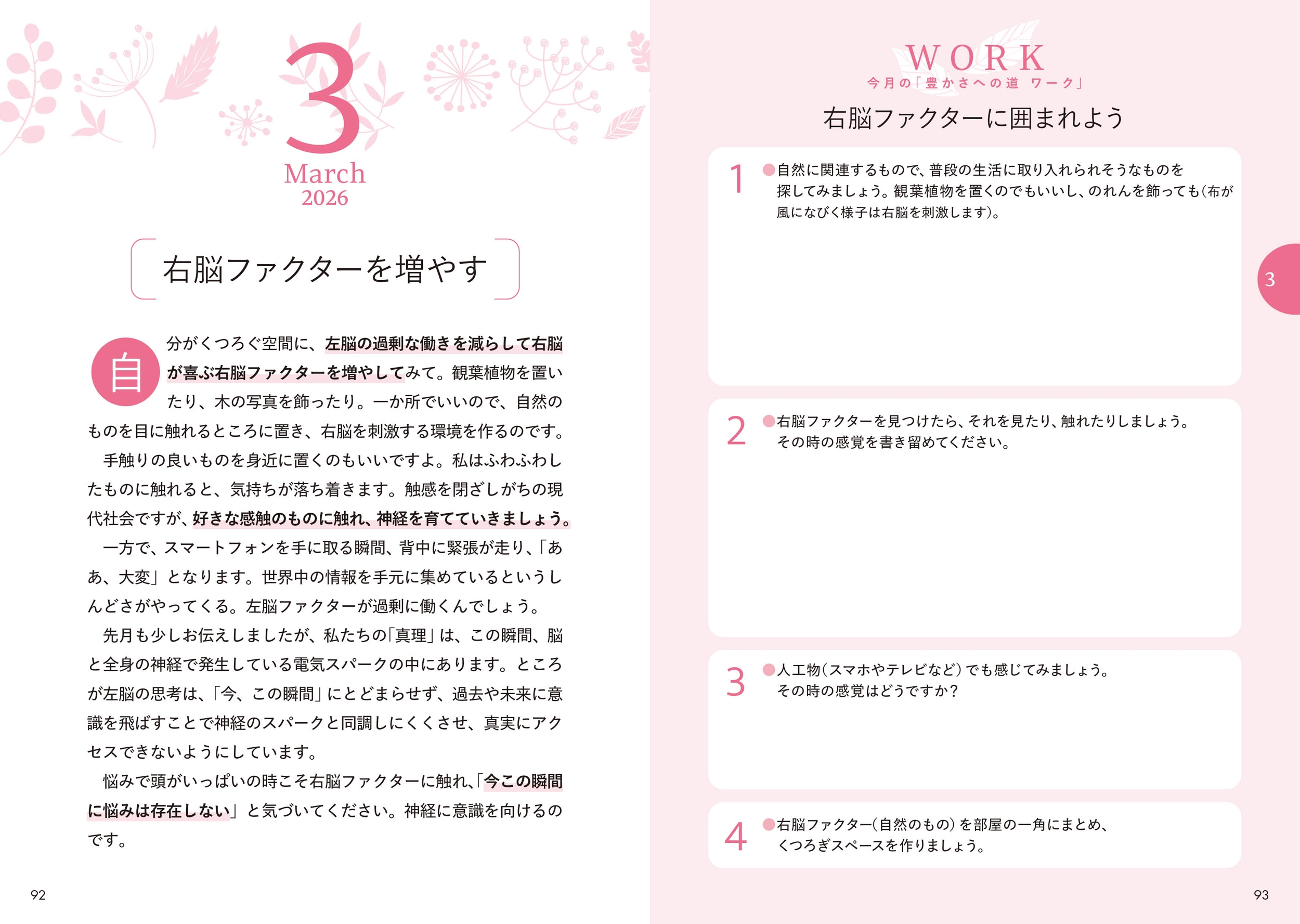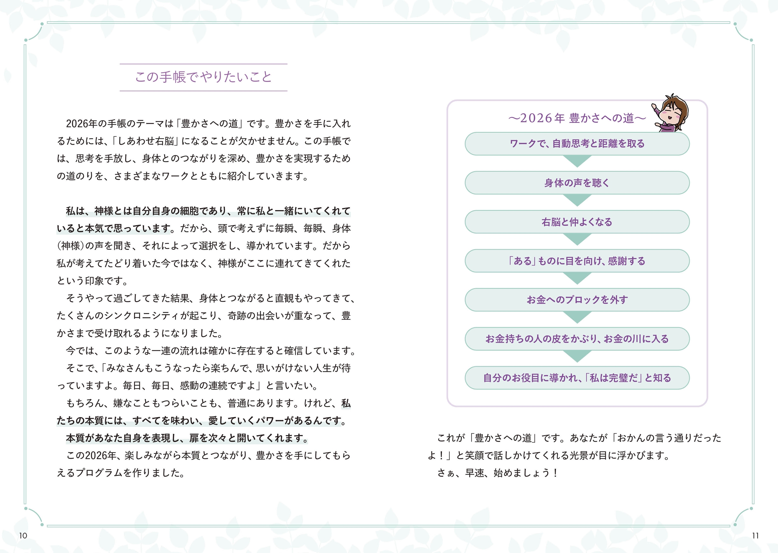 2026年版の大きなテーマは、「豊かさとつながる」。日々の身体のワークと、毎月順に取り組んでいくテーマワーク、月終わりに振り返りを行うことで、意識変容ができるとともに、豊かさへの道へ向かうことができるような構成になっています。自分の持っていると気づいたこと、感謝できることを書き込む欄や、週ごとのミニコラムも。手帳使いを応援してくれる、オリジナルキャラクターシールつき。