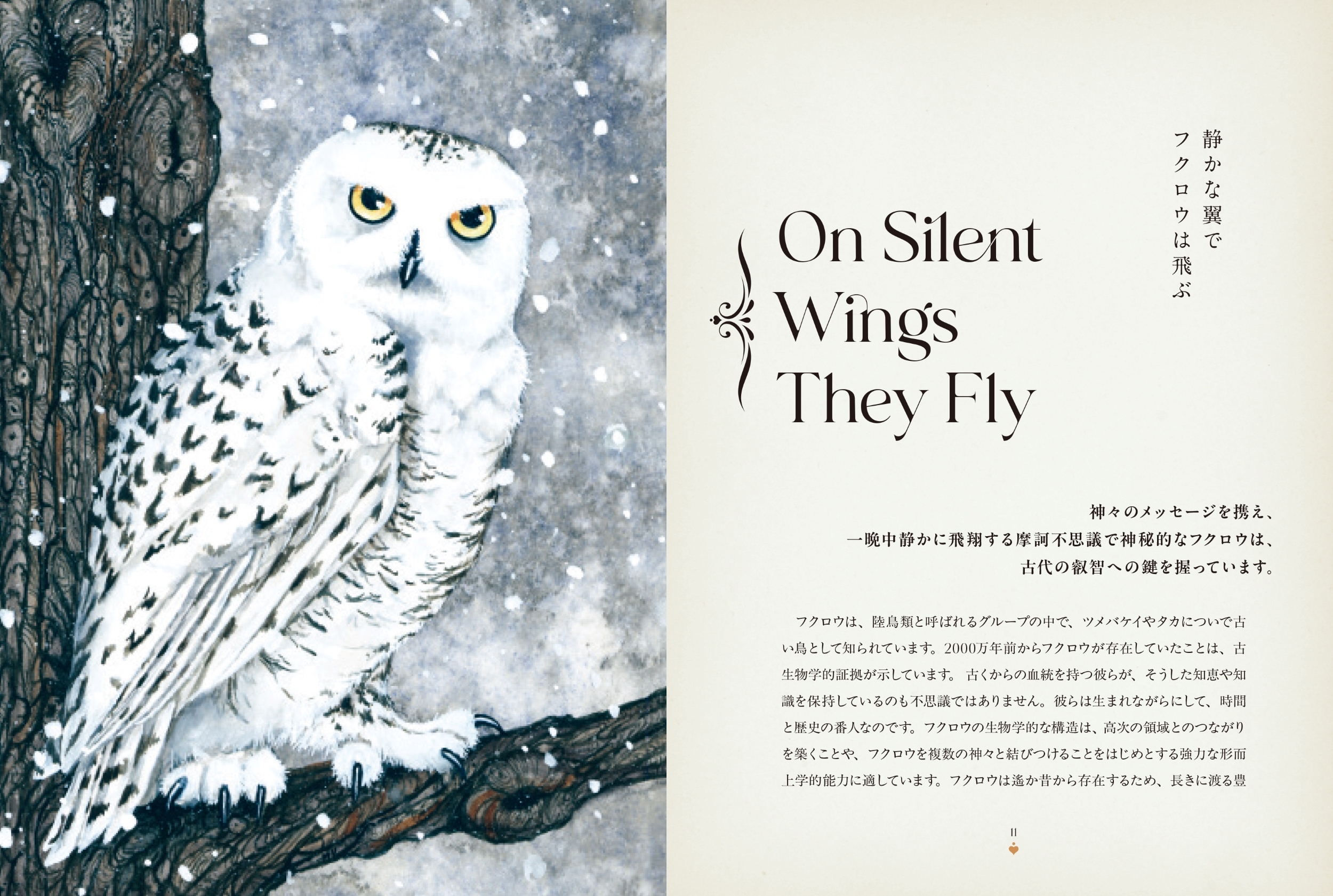 フクロウは、夜の闇でもすべてを見通す大きな目を持ち、魔法世界とは切っても切れない神秘的な猛禽類。