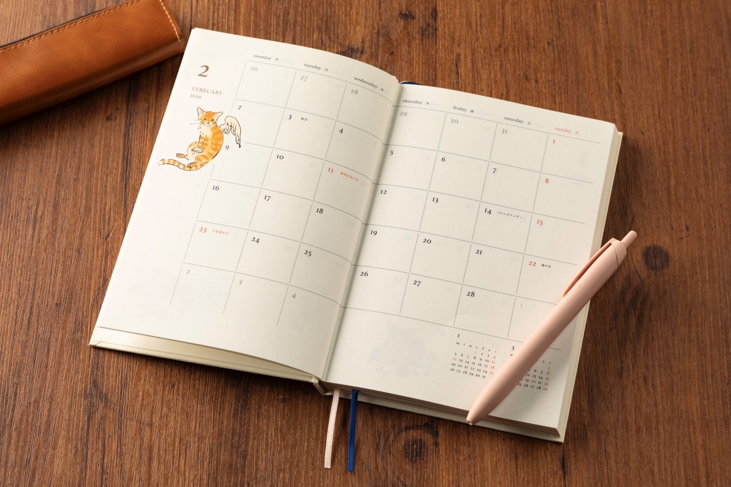 ◆マンスリー+ウィークリー(左右で内容を書き分けられるガイド線入り)+フリーリスト+メモページの構成で、実用性も抜群。くらはしさんならではの猫にまつわる記念日も掲載。