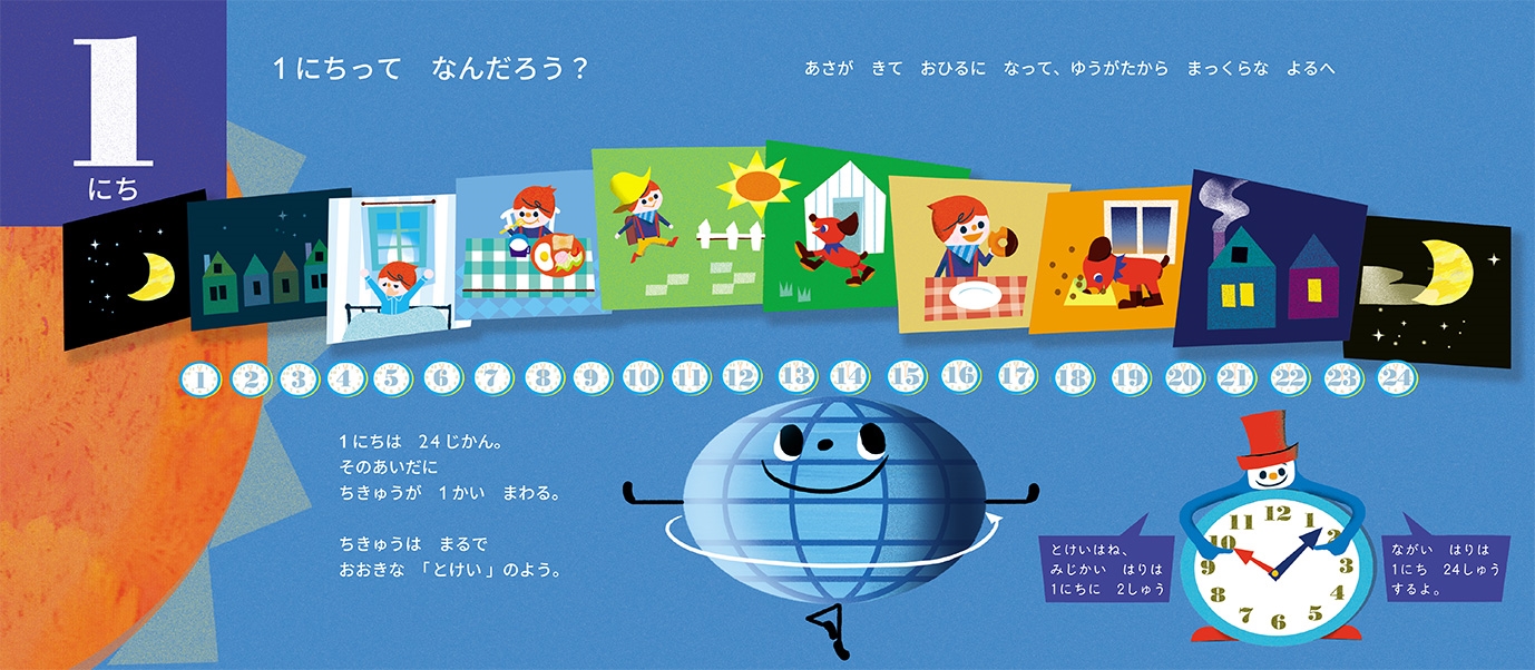 8時までに出かける準備をして、12時にお昼ごはんをたべて…でも、いったい時間ってなに? 1秒、1分、1時間、1日。時間についている名前のこと、地球上にあるいろいろな時間、生きものによってもちがう時間。