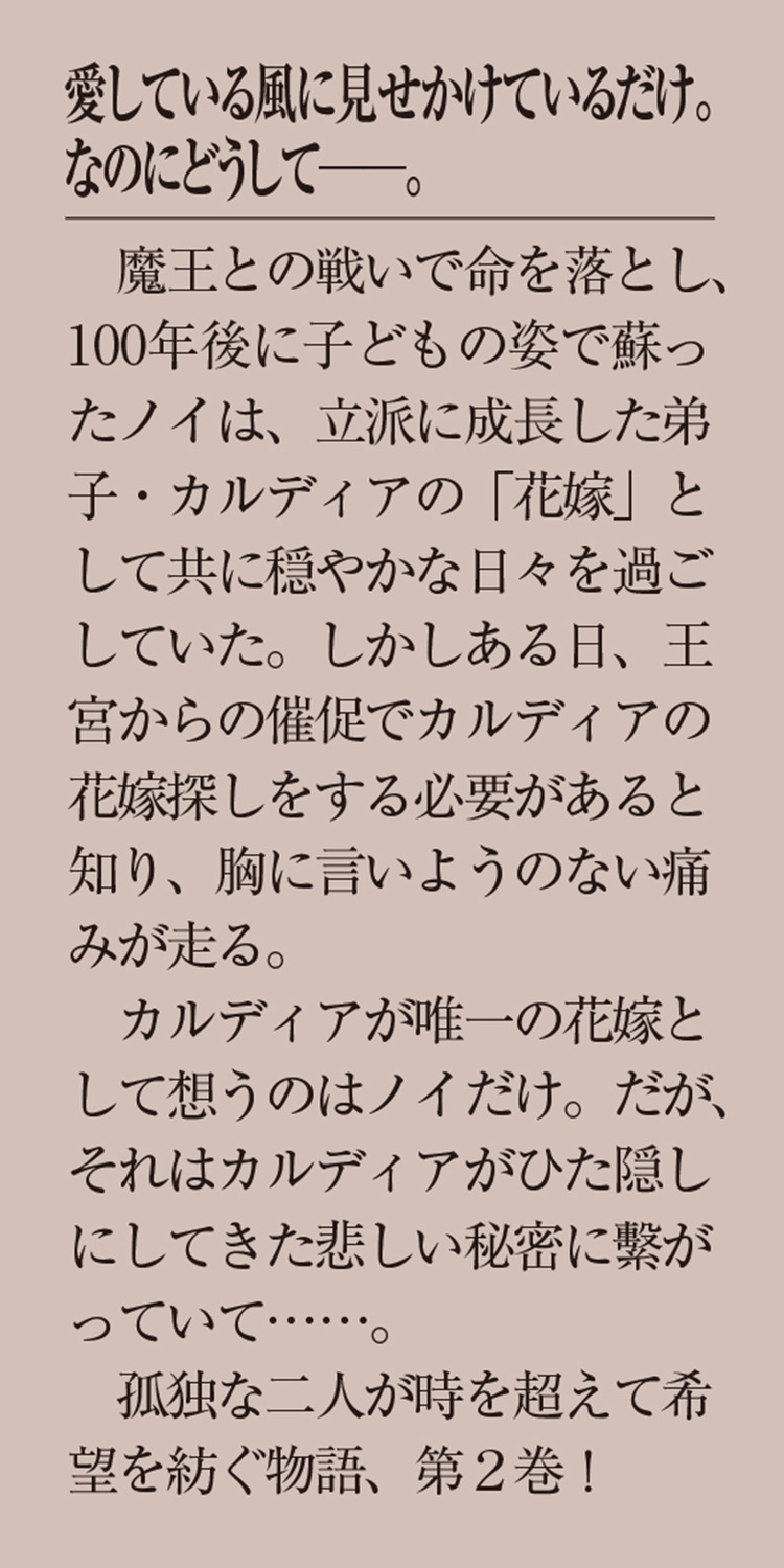 魔王との戦いで命を落とし、100年後に子どもの姿で蘇ったノイは、立派に成長した弟子・カルディアの「花嫁」として共に穏やかな日々を過ごしていた。しかしある日、王宮からの催促でカルディアの花嫁探しをする必要があると知り、胸に言いようのない痛みが走る。