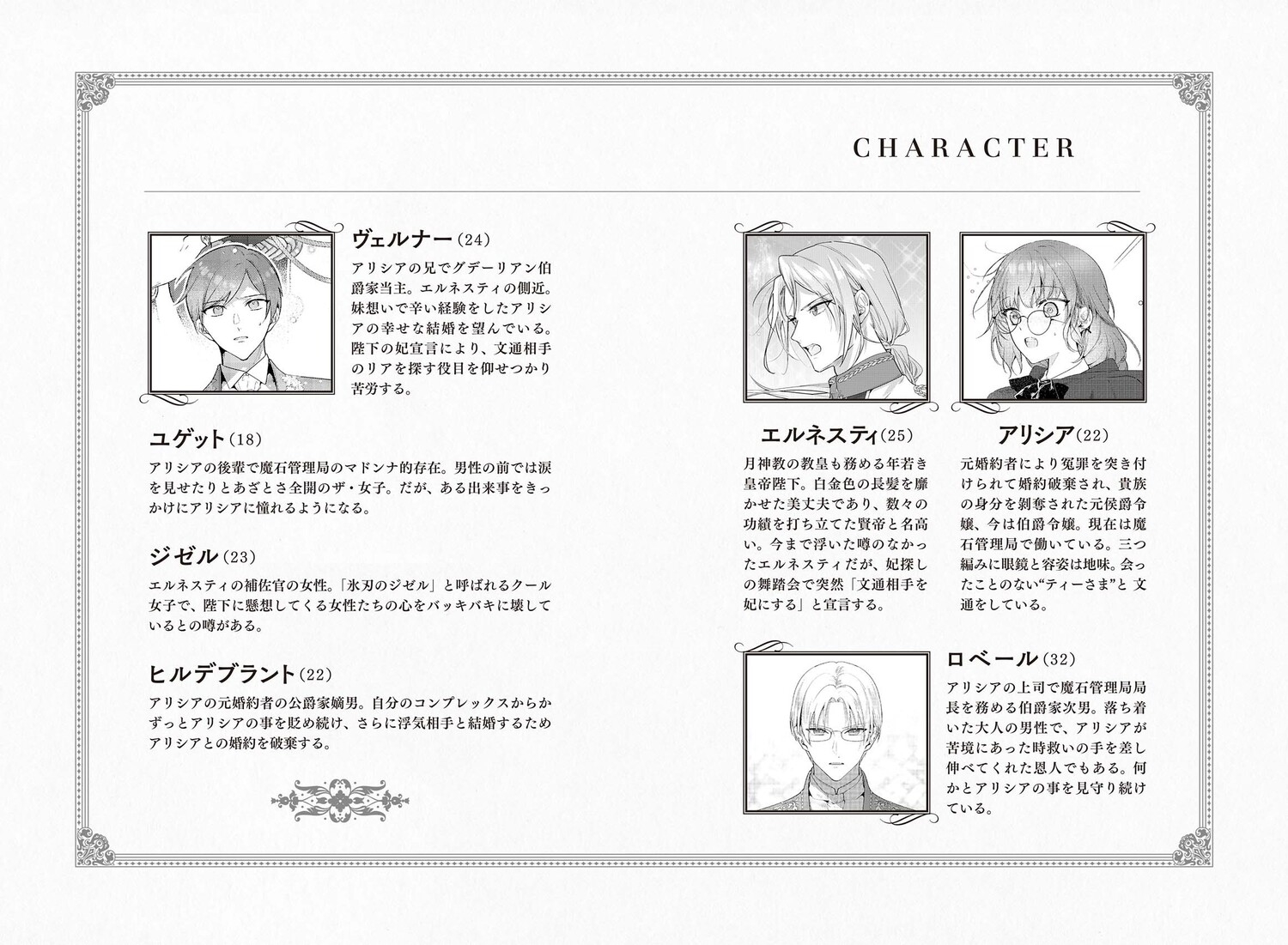 魔石管理局で働く伯爵令嬢アリシアは、いつもダサい三つ編みに眼鏡で、陰で地味メガネとかお局様とか呼ばれている。アリシアの密かな楽しみは、ティー様という殿方とのお互い正体を隠しての文通くらいだ。過去にこっぴどく婚約破棄をされたことがあり、結婚など諦めていたが、妹を心配する兄に超絶美形の皇帝陛下の妃を探す舞踏会に無理やり連れてこられた。ところがその舞踏会で、陛下がまさかの宣言をする!「私は文通相手を我が正妃、皇后にしたいと考えている。リア、私はティーだ」文通相手のティー様が皇帝陛下? しかも私を皇后に? 無理無理無理。ところが、何の因果か陛下のお相手探しを手伝うことに――。舞踏会の真ん中で愛を叫ぶ皇帝陛下と、彼に正体を知られたくない地味令嬢の両想いすれ違いラブ!
