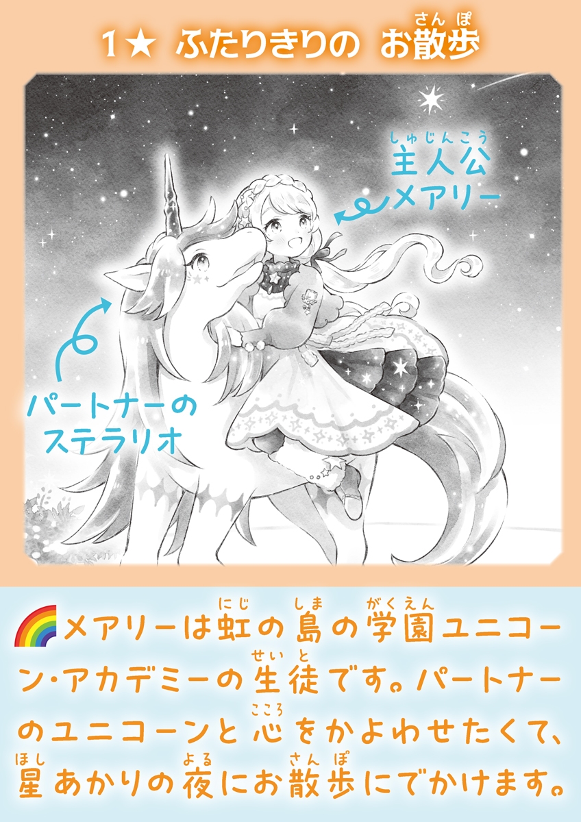 主人公は、おっとりした性格のメアリー。みんなの意見がぶつかりそうになると、けんかにならないようにがんばる、やさしい女の子です。でも一方では、パートナーのユニコーン、ステラリオにも、思っていることを伝えられずにいました。