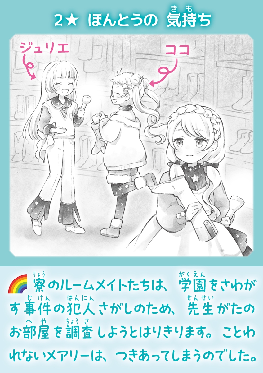 ステラリオはひかえめなメアリーを守り、ひっぱっていこうと、お出かけの提案をしたり、仲間の誘いをかわりにことわったり…。でも、それはメアリーの本意ではありません。心のみぞはしだいに深まっていき…そんなとき、学園に大事件が起こるのです!