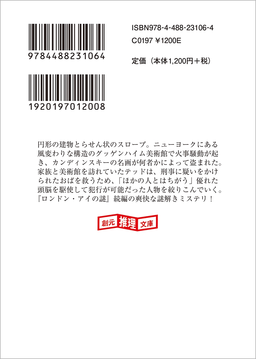 円形の建物とらせん状のスロープ。ニューヨークにある風変わりな構造のグッゲンハイム美術館で火事騒動が起き、カンディンスキーの名画が何者かによって盗まれた。家族と美術館を訪れていたテッドは、刑事に疑いをかけられたおばを救うため、「ほかの人とはちがう」優れた頭脳を駆使して犯行が可能だった人物を絞りこんでいく。『ロンドン・アイの謎』続編の爽快な謎解きミステリ! 訳者あとがき=越前敏弥/解説=川出正樹