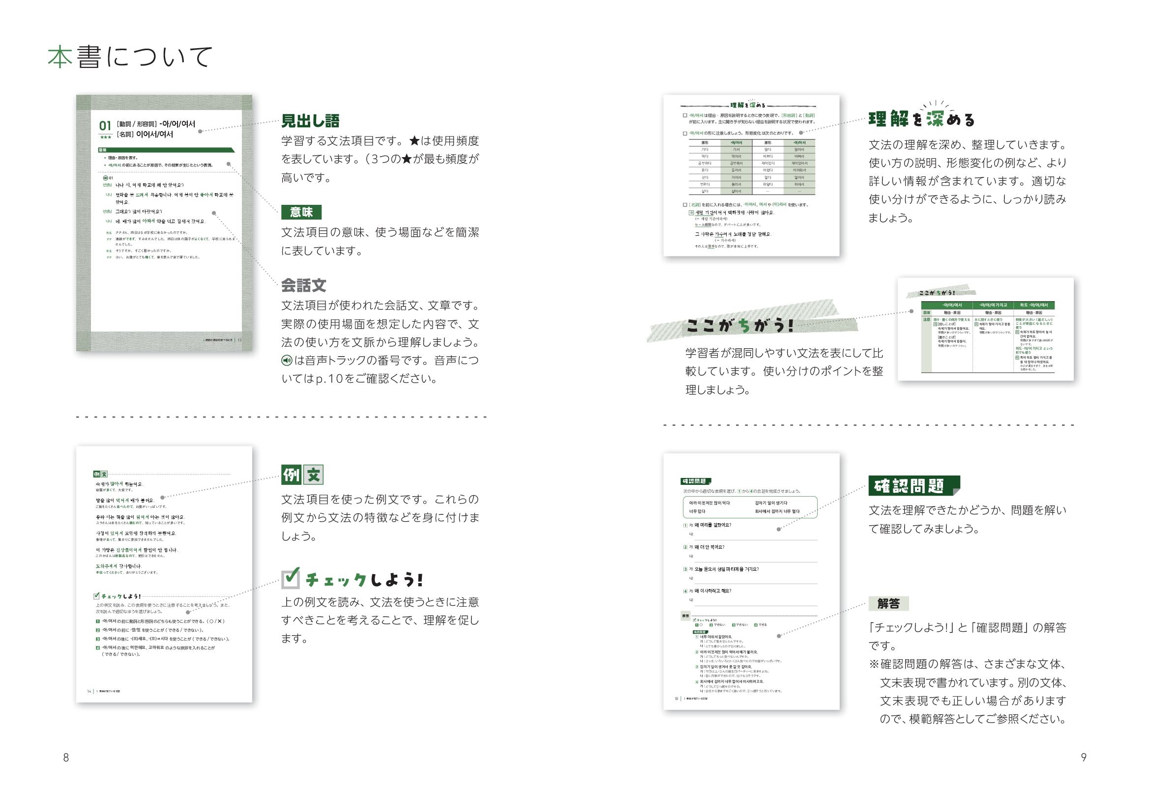 本書は、そのような学習者の悩みを解決し、もっと上手に韓国語を使えるようになって欲しいという著者の想いから生まれた教材です。