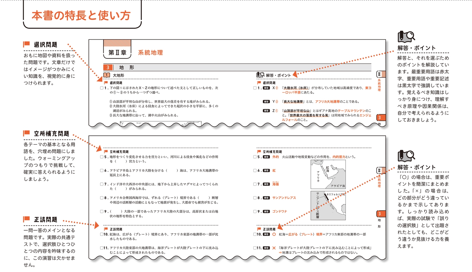 設問は、センター試験~共通テストで実際に出題された問題を原典とし、選択問題・空所補充問題・正誤問題の3つの形式で構成しました。