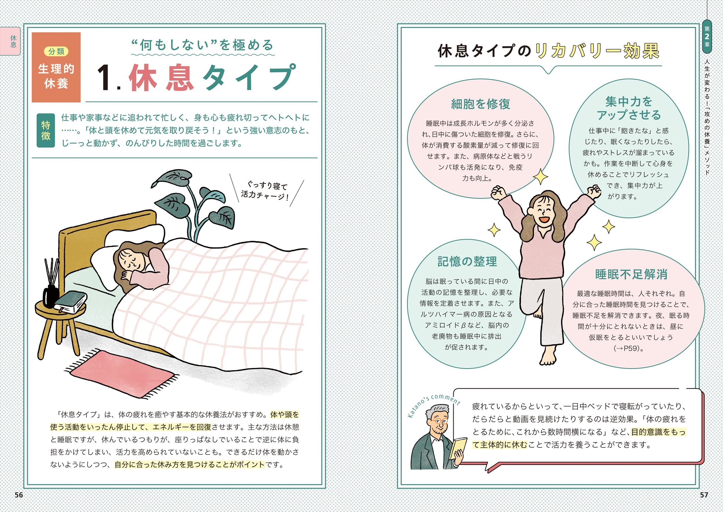 本書では、7つの休養タイプを紹介。自分に合った最適な休み方を知り、その実践法をバランスよく取り入れることで、心身をしっかり回復させることができます。